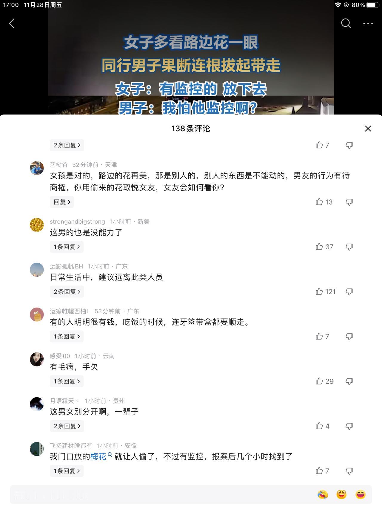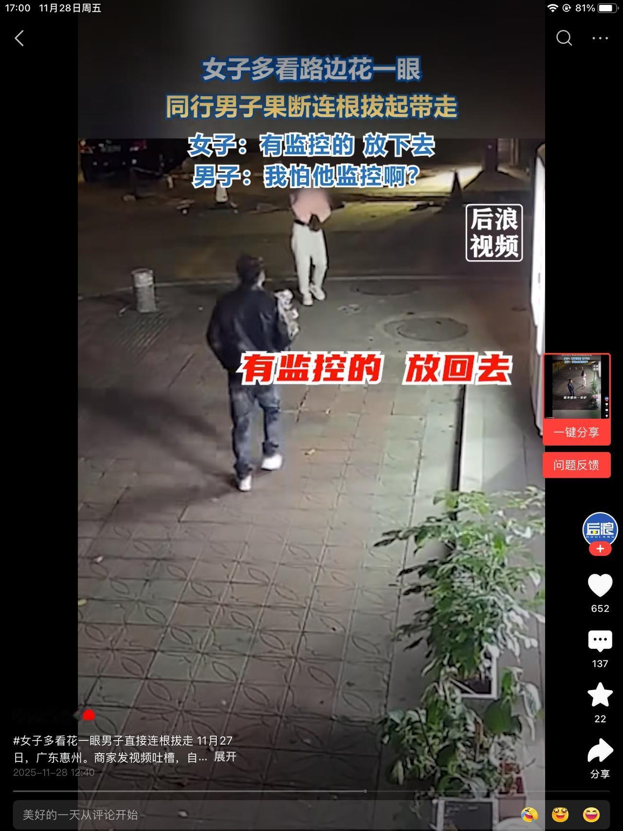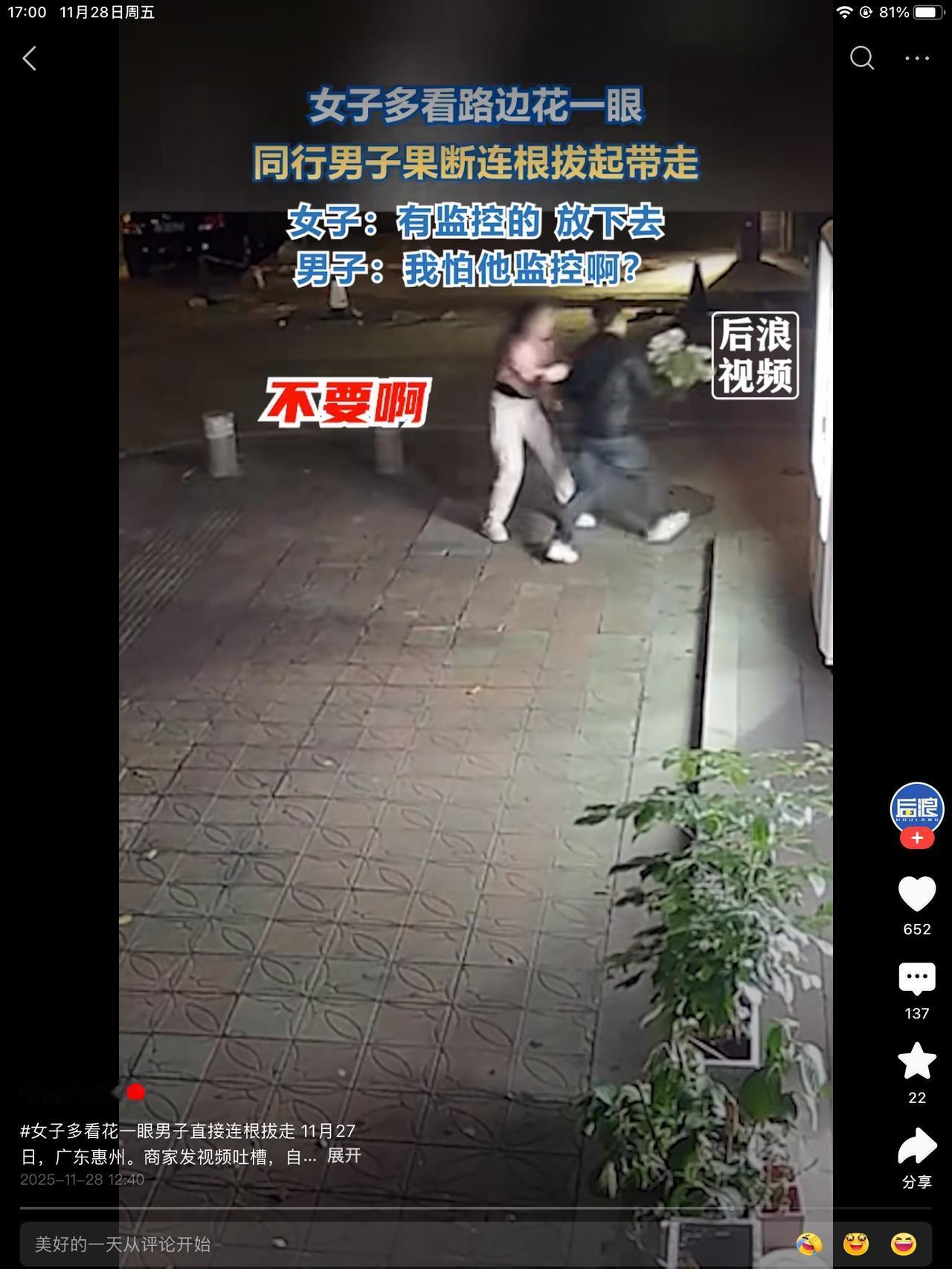 不要跟坏心眼没素质的人做朋友! 一女子路上,看了花一眼,男子立马薅出来,准备送给女子。女子大声喊,不要,有监控。放回去。男子说我怕它监控啊! 真的很尬。又没说让你买,就这么肆无忌惮的,像自己后花园一样,随手就把别人的东西据为己有。真的很下作。没品,不要跟他交往甚密。很拉低档次。 有钱可以去买,没钱可以看看,这行为,癞蛤蟆跳人脚背上,不咬人膈应人!