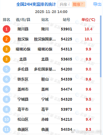 【升温】今天在冷空气过后,东北华北黄淮等地气温回升。山西陵川升10.4℃、内蒙古敖汉旗升10.1℃、内蒙古喀喇沁旗升9.9℃、山西盂县升9.9℃、内蒙古多伦升9.8℃,排在14时升温榜前5。随着气温回升,长春重回0℃以上,郑州冲上20℃。明天郑州可能超22℃,将打破11月下旬最高气温纪录(21.7℃)。