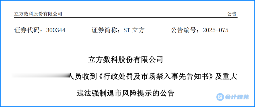 近日,证监会对上市公司立方数科股份有限公司(简称立方数科)涉嫌定期报告财务数据存在虚假记载作出行政处罚及市场禁入事先告知。