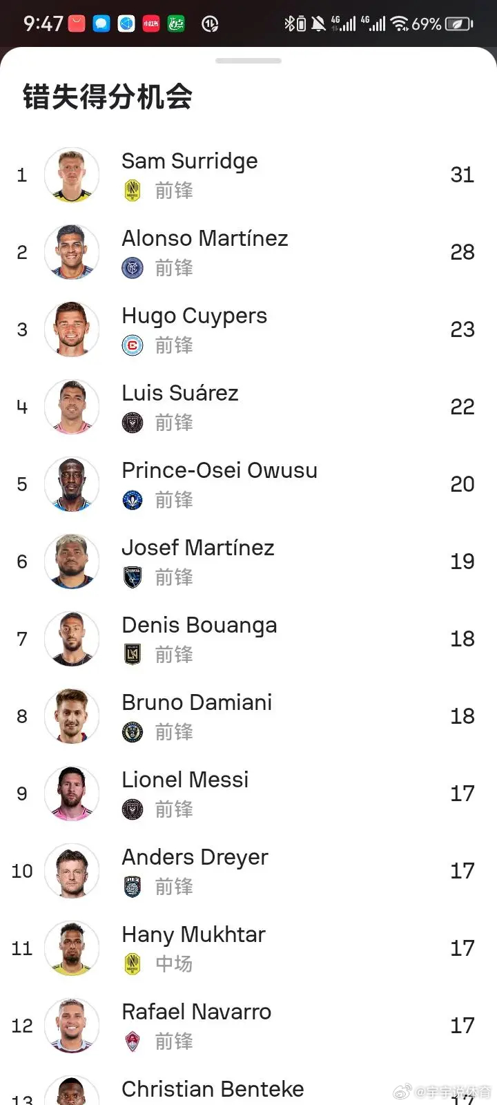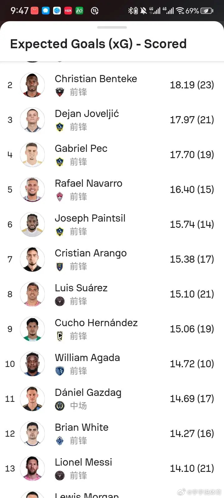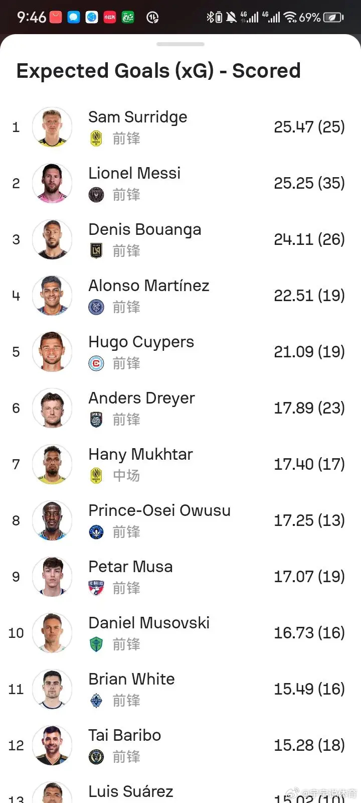 无解射术——梅西本赛季美职联实际进球与预期进球差值又接近10球梅西上赛季美职联在预期进球为14.10的情况下打进21球,超预期接近7球,错失绝佳机会8次,进球与错失机会比高达2.62。本赛季则在预期进球为25.25情况下打进35球,超预期接近10球,错失绝佳机会17次,进球与错失机会比又达到2以上,为2.05连续两赛季实际超预期6球以上,并且进球与错失机会比达到2以上,展现了极佳的射术。