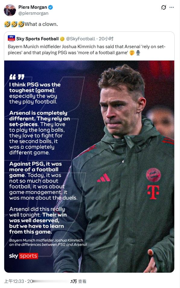 直播吧11月28日讯英国主持人、著名阿森纳球迷皮尔斯·摩根在社交媒体炮轰基米希,直言其是“小丑”。