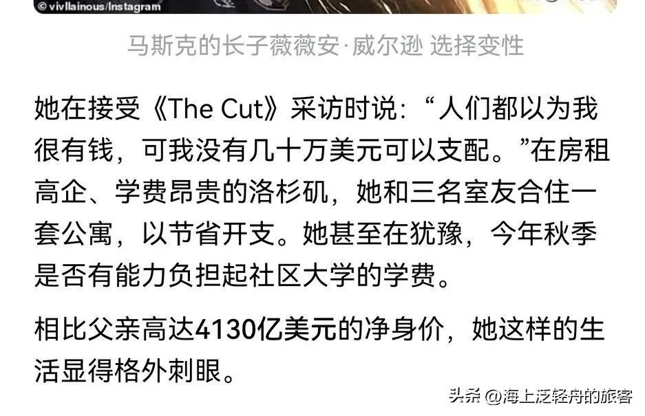 马斯克大儿子后悔了! 马斯克大儿子变性后,跟父亲断绝关系,现在坦言生活困难,甚