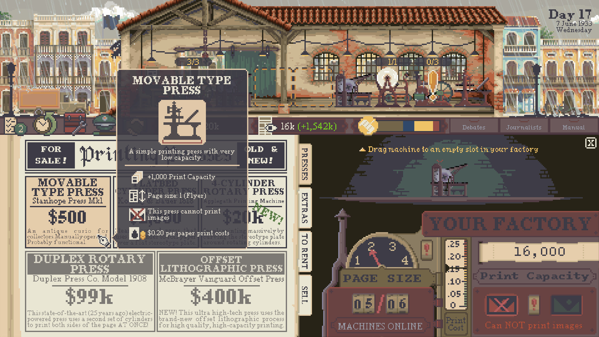 【重生之我是新闻学高手】报社模拟经营游戏《Stop the Press!》Steam商店页面已上线,发售日期待定。你将在游戏中经营一家报社,在即将爆发革命之际操控头条新闻,推动你的计划。你需要给你的印刷机更新换代,构思发行战略,扩大读者群体,还有规避审查,甚至还要躲避秘密警察的注意。势力强大的团体会压制你的编辑自由,你是会屈服于压力,成为政权的卒子?是会孤独一掷、抗争到底?还是会收受贿赂,不顾读者反对,刊登大企业的广告?Steam游戏推荐