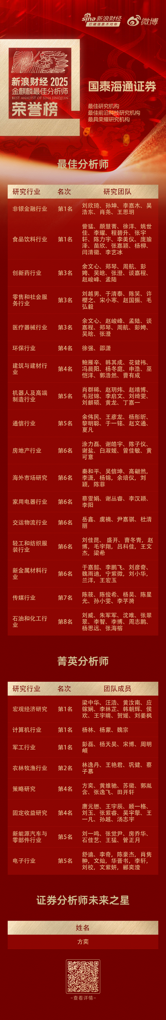 最佳分析师荣誉榜,国泰海通证券荣获17个领域研究大奖,2个行业荣获第一名,菁英分析师荣誉榜,国泰海通证券荣获8个领域研究大奖,3个行业荣获第一名,国泰海通证券策略研究行业分析师方奕荣获金麒麟证券分析师·未来之星殊荣。名单如下:
