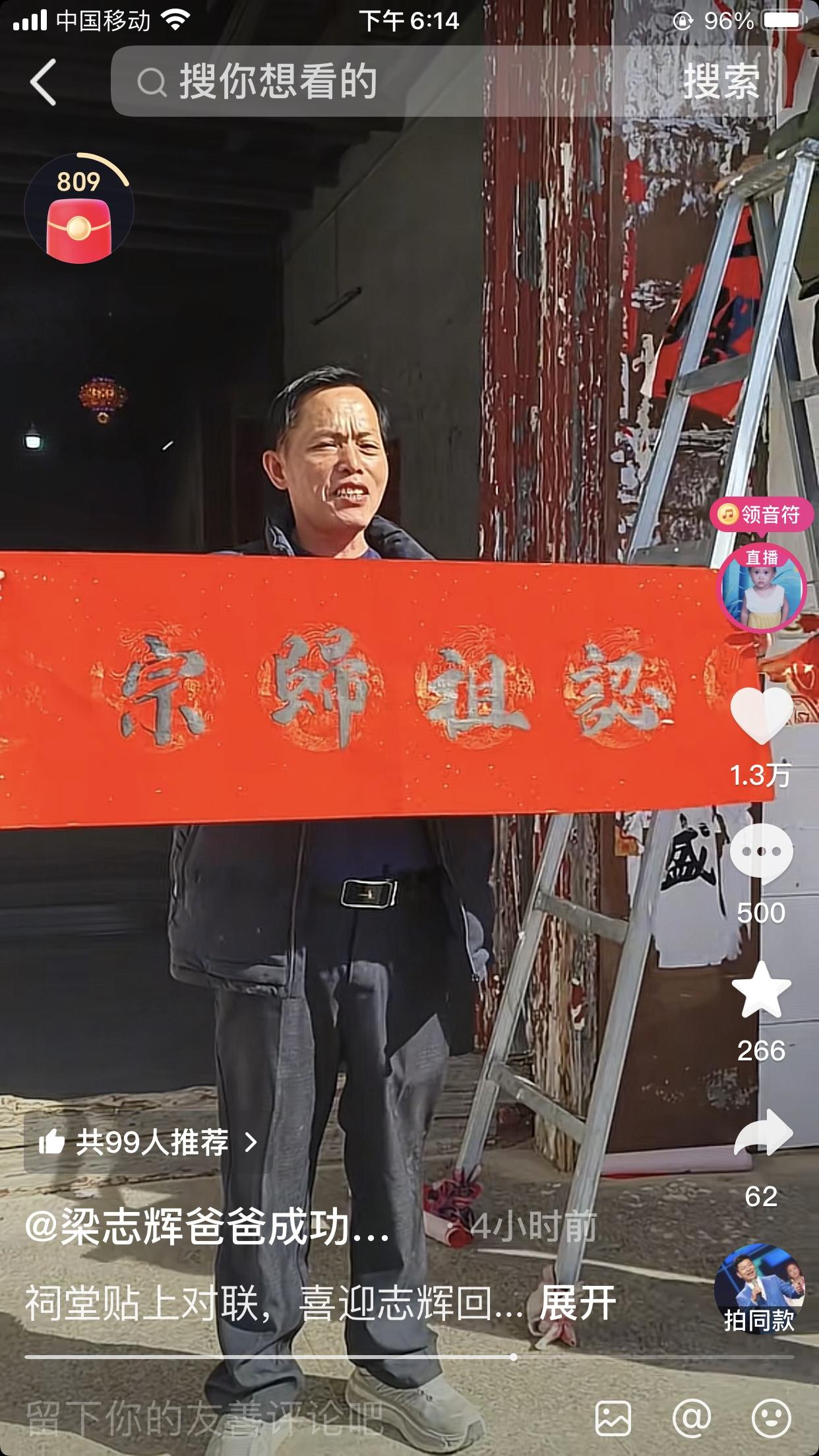 梁志辉的认亲宴定在了29号,寻亲成功也将近一个月了,梁爸梁妈都带了几场货了,却始终没见到儿子梁志辉。 梁爸接受采访时说:明天只是儿子志辉回来,孙子和儿媳都不回来。 十年前,梁志辉看见过他爸爸在福建鼓浪屿举个牌子的,但是他不知道他是被拐卖的。 据说梁志辉现在福建,他多次和梁爸梁妈说,认亲宴还是要低调,少花钱,估计现在他心情很复杂,买家养他30年了有感情,亲生父母这边找了30年付出也很多,希望他两边都联系,不让梁爸遗憾. 不管后面认不认回来,孩子活着,找到了就是最好的结局