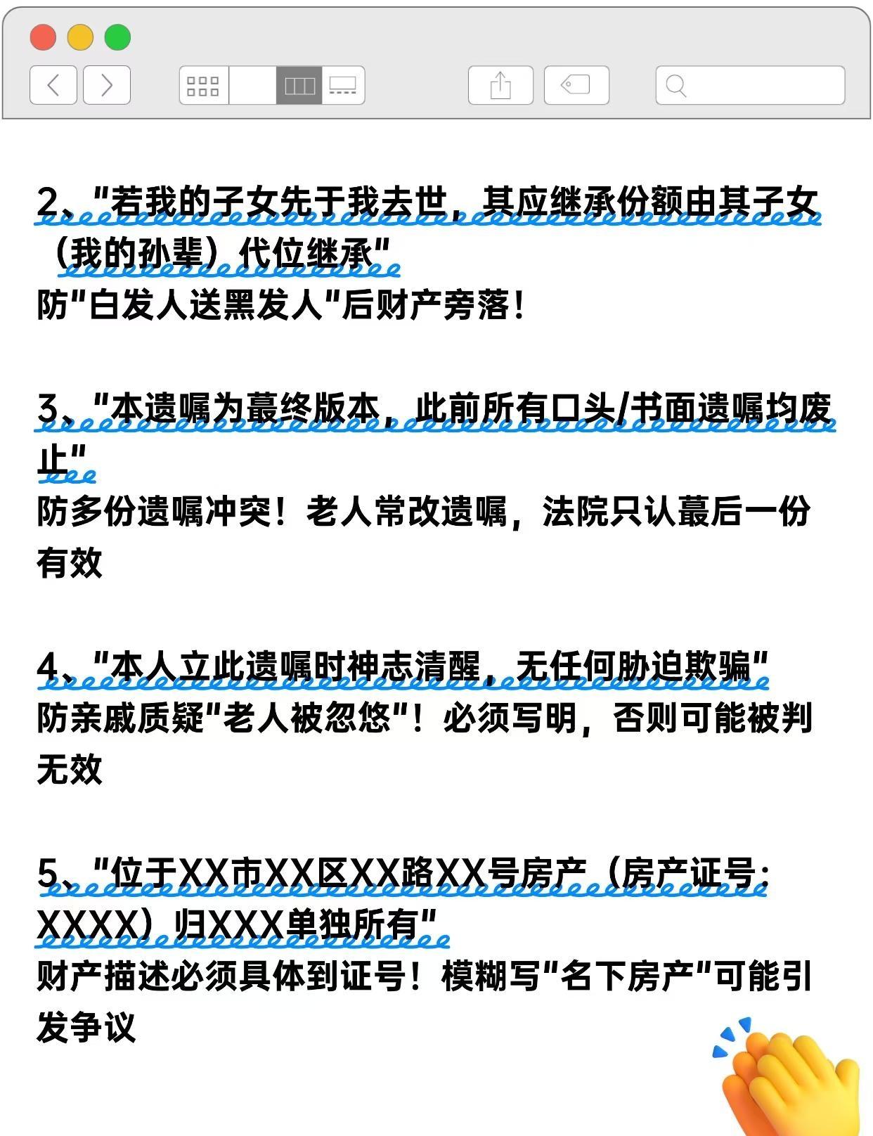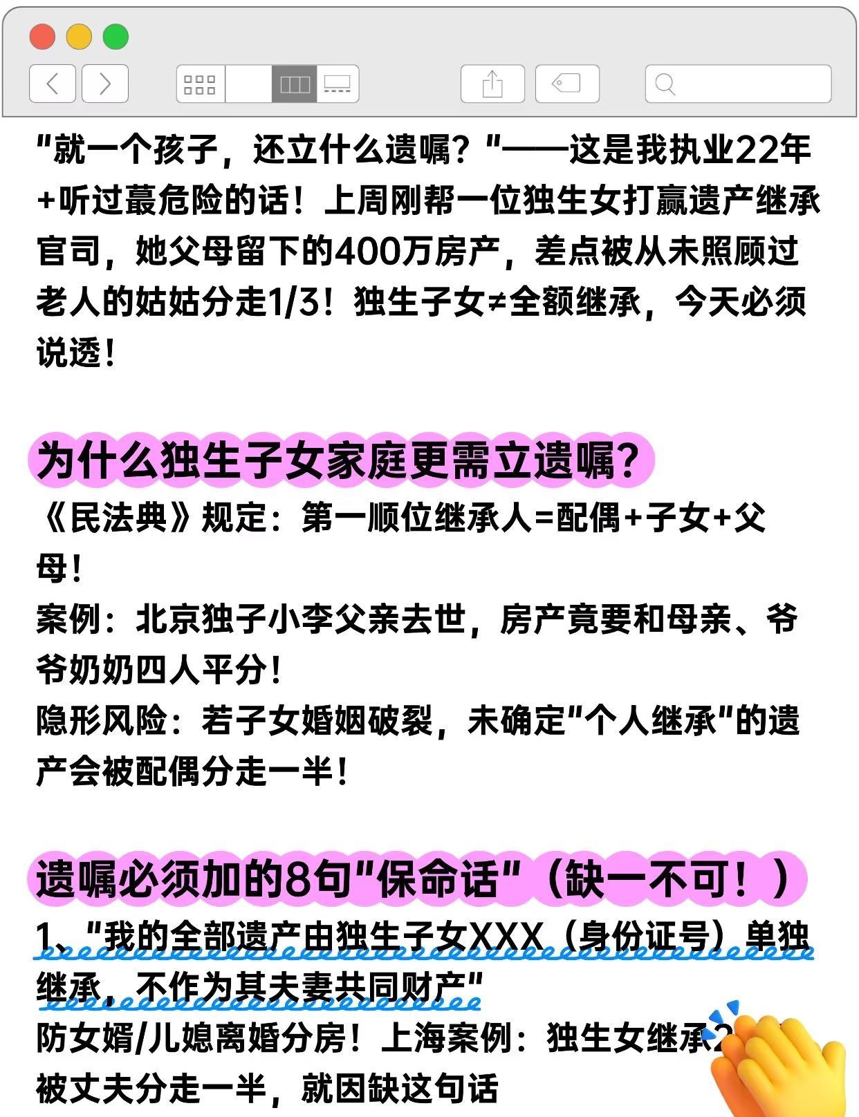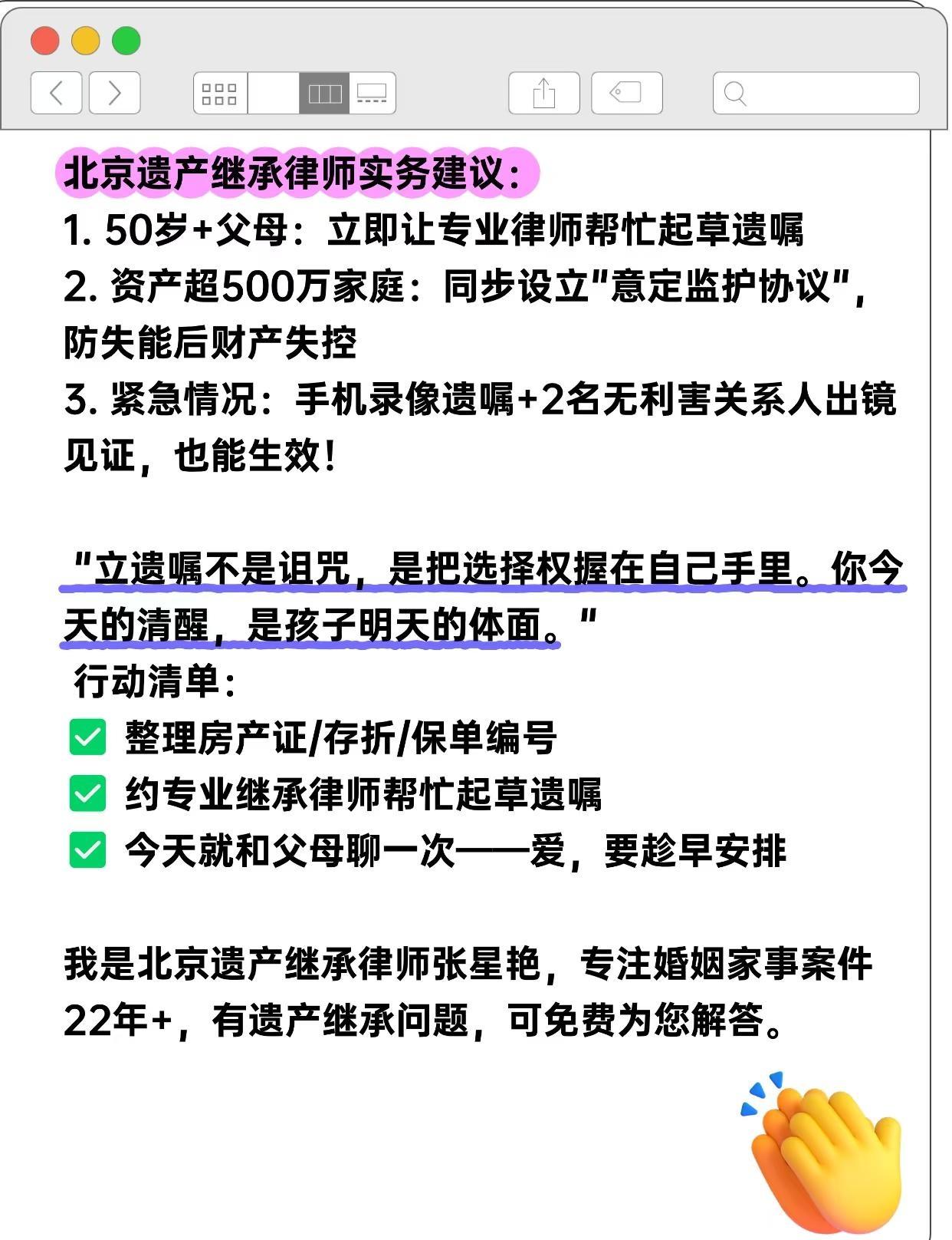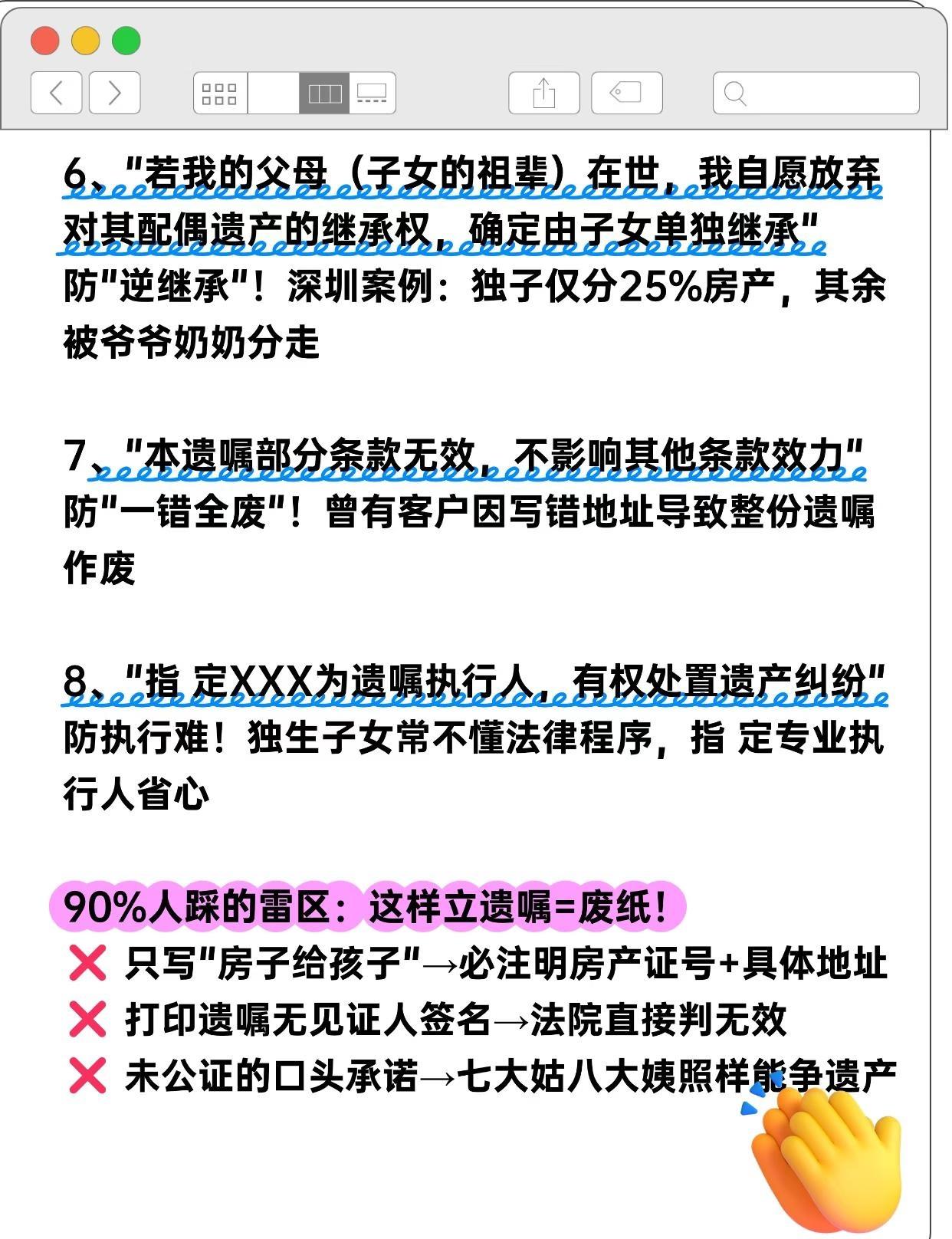 独生子女立遗嘱不加这8句话,小心人财两空 "就一个孩子,还立什么遗嘱?"——这是我执业22年+听过蕞危险的话!上周刚帮一位独生女打赢遗产继承官司,她父母留下的400万房产,差点被从未照顾过老人的姑姑分走1/3!独生子女≠全额继承,今天必须说透 为什么独生子女家庭更需立遗嘱? 《民法典》规定:第一顺位继承人=配偶+子女+父母 案例:北京独子小李父亲去世,房产竟要和母亲、爷爷奶奶四人平分 隐形风险:若子女婚姻破裂,未确定"个人继承"的遗产会被配偶分走一半 遗嘱必须加的8句"保命话"(缺一不可) [一]"我的全部遗产由独生子女X(身份证号)单独继承,不作为其夫妻共同财产" 防女婿/儿媳离婚分房 [二]"若我的子女先于我去世,其应继承份额由其子女(我的孙辈)代位继承" 防"白发人送黑发人"后财产旁落 [三]"本遗嘱为蕞终版本,此前所有口头/书面遗嘱均废止" 防多份遗嘱冲突!老人常改遗嘱,法院只认蕞后一份有效 [四]"本人立此遗嘱时神志清醒,无任何胁迫欺骗" 防亲戚质疑"老人被忽悠"!必须写明,否则可能被判无效 [五]"位于X市X区X路X号房产(房产证号:X)归X单独所有" 财产描述必须具体到证号!模糊写"名下房产"可能引发争议 [六]"若我的父母(子女的祖辈)在世,我自愿放弃对其配偶遗产的继承权,确定由子女单独继承" 防"逆继承"!深圳案例:独子仅分25%房产,其余被爷爷奶奶分走 [七]"本遗嘱部分条款无效,不影响其他条款效力" 防"一错全废"!曾有客户因写错地址导致整份遗嘱作废 [八]"指 定XXX为遗嘱执行人,有权处置遗产纠纷" 防执行难!独生子女常不懂法律程序,指 定专业执行人省心 90%人踩的雷区:这样立遗嘱=废纸 ❌ 只写"房子给孩子"→必须注明房产证号+具体地址 ❌ 打印遗嘱无见证人签名→法院直接判无效 ❌ 未公证的口头承诺→七大姑八大姨照样能争产 北京遗产继承律师实务建议: 1. 50岁+父母:立即让专业律师帮忙起草遗嘱 2. 资产超500万家庭:同步设立"意定监护协议",防失能后财产失控 3. 紧急情况:手机录像遗嘱+2名无利害关系人出镜见证,也能生效 [心]我是北京婚姻律师张星艳,专注婚姻家事法律服务22年+,如果您有遗产继承等问题,可免费为您解答。遗嘱 遗嘱继承 遗嘱继承纠纷 自书遗嘱 北京遗产继承纠纷律师 北京遗产继承律师 北京遗产继承 继承 北京遗嘱继承