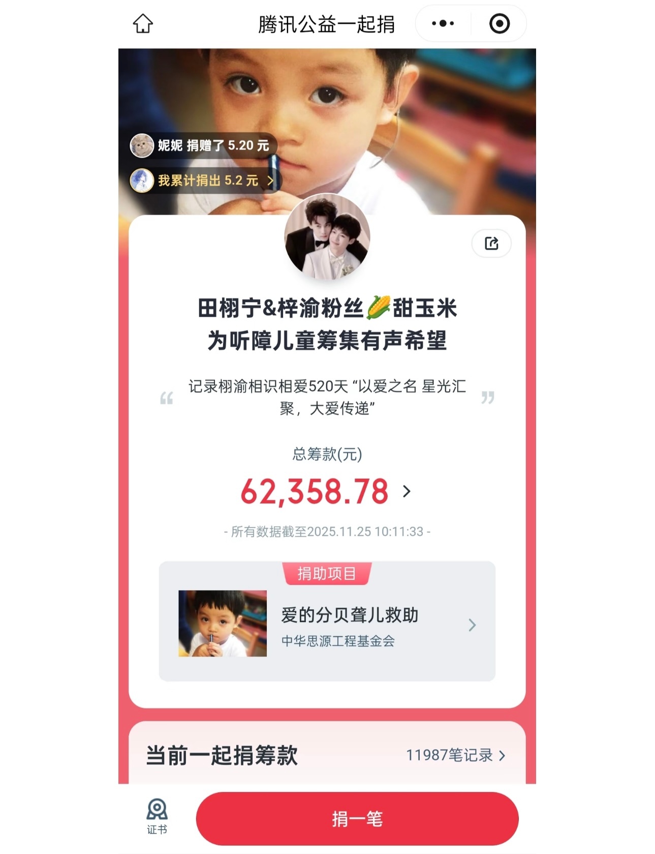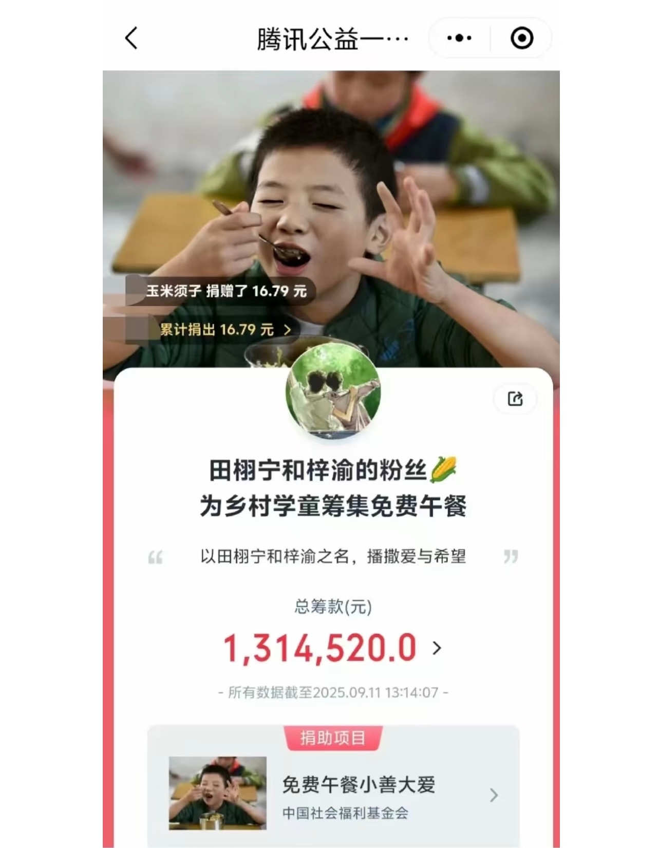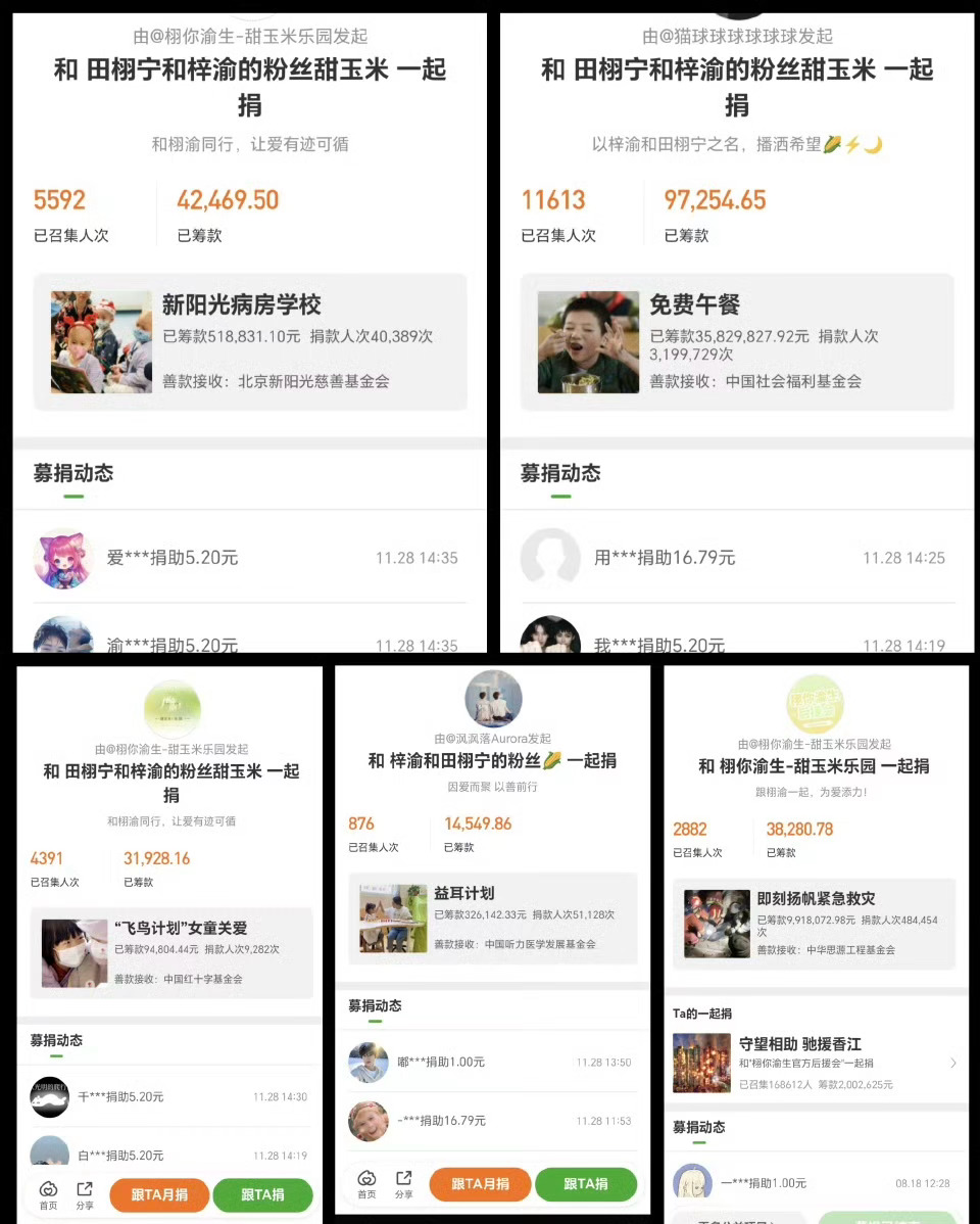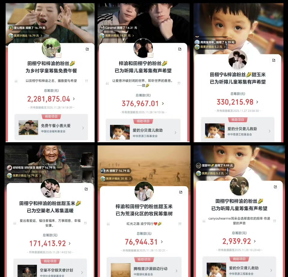 栩你渝生后援会捐款超过200万元不到24小时,由“栩你渝生”后援会发起的捐款已有超过16万人参与,筹集到的善款超200万元!无论是最开始的【为乡村儿童筹集免费午餐】,还是后来的【为听障儿童筹集有声希望】,再到现在的【为香港火灾事件捐款】,田栩宁和梓渝的甜玉米🌽们的善良从来不是说说而已,一直在把感受到的爱传递给所有人。辽阔的玉米地生不出狭隘的爱,希望大家都平安、健康,好好吃饭,好好睡觉。