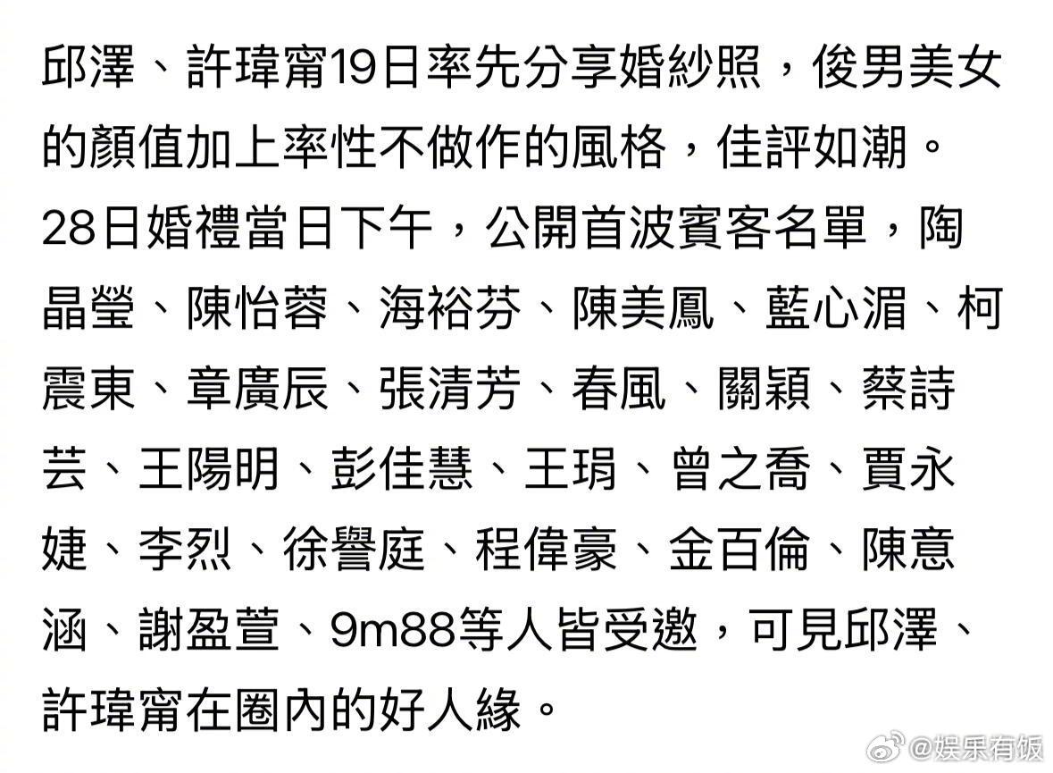 邱泽许玮甯婚礼嘉宾名单 28 日晚,邱泽与许玮甯的婚宴在台北文华东方酒店举行,首波宾客名单于当日下午公开,陶晶莹、陈怡蓉、海裕芬、陈美凤、蓝心湄、柯震东、章广辰、张清芳、春风、关颖、蔡诗芸、王阳明、彭佳慧、王琄、曾之乔、贾永婕、李烈、徐誉庭、程伟豪、金百伦、陈意涵、谢盈萱、9m88 等演艺圈大咖均受邀出席,涵盖影视歌三栖艺人,尽显两人圈内好人缘。此前 11 月 19 日,邱泽与许玮甯已发布率性不做作的婚纱照,收获大量好评;婚礼当天则以 “亲友祝福” 为主轴,低调却不失质感的安排,让这场演艺圈盛事既温馨又充满星光。