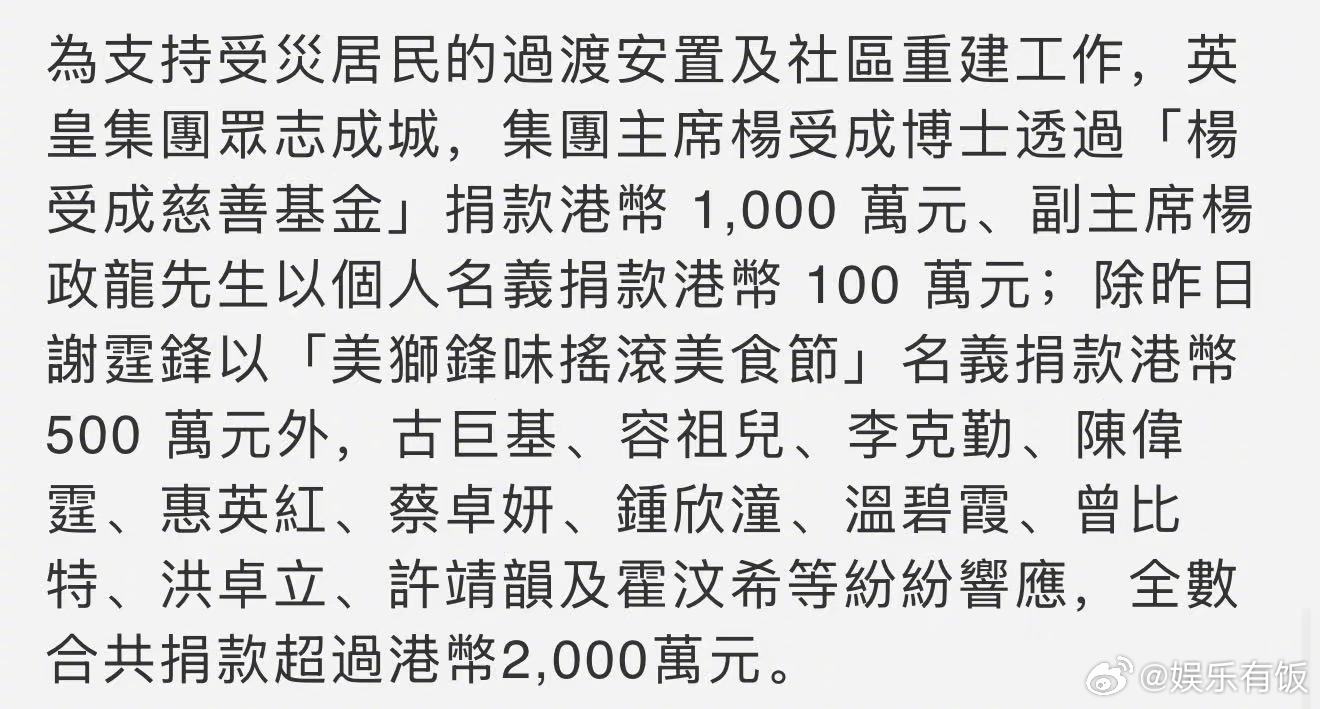 陈伟霆捐款100万元为香港大埔宏福苑火灾事故捐款100万,用于火灾救援及灾后安置。风雨同舟,守望相助,愿受灾民众生活早日恢复。陈伟霆为香港火灾捐款100万