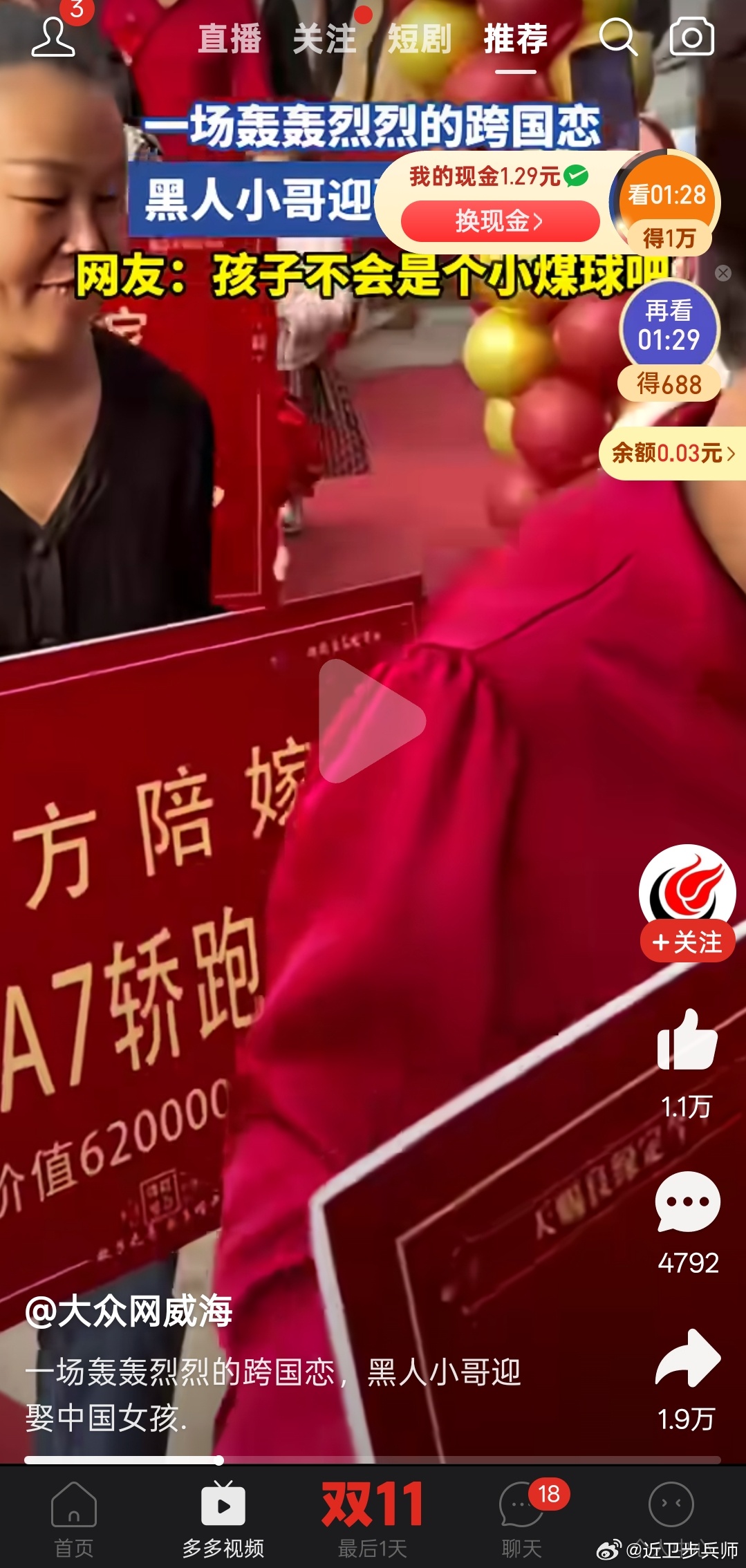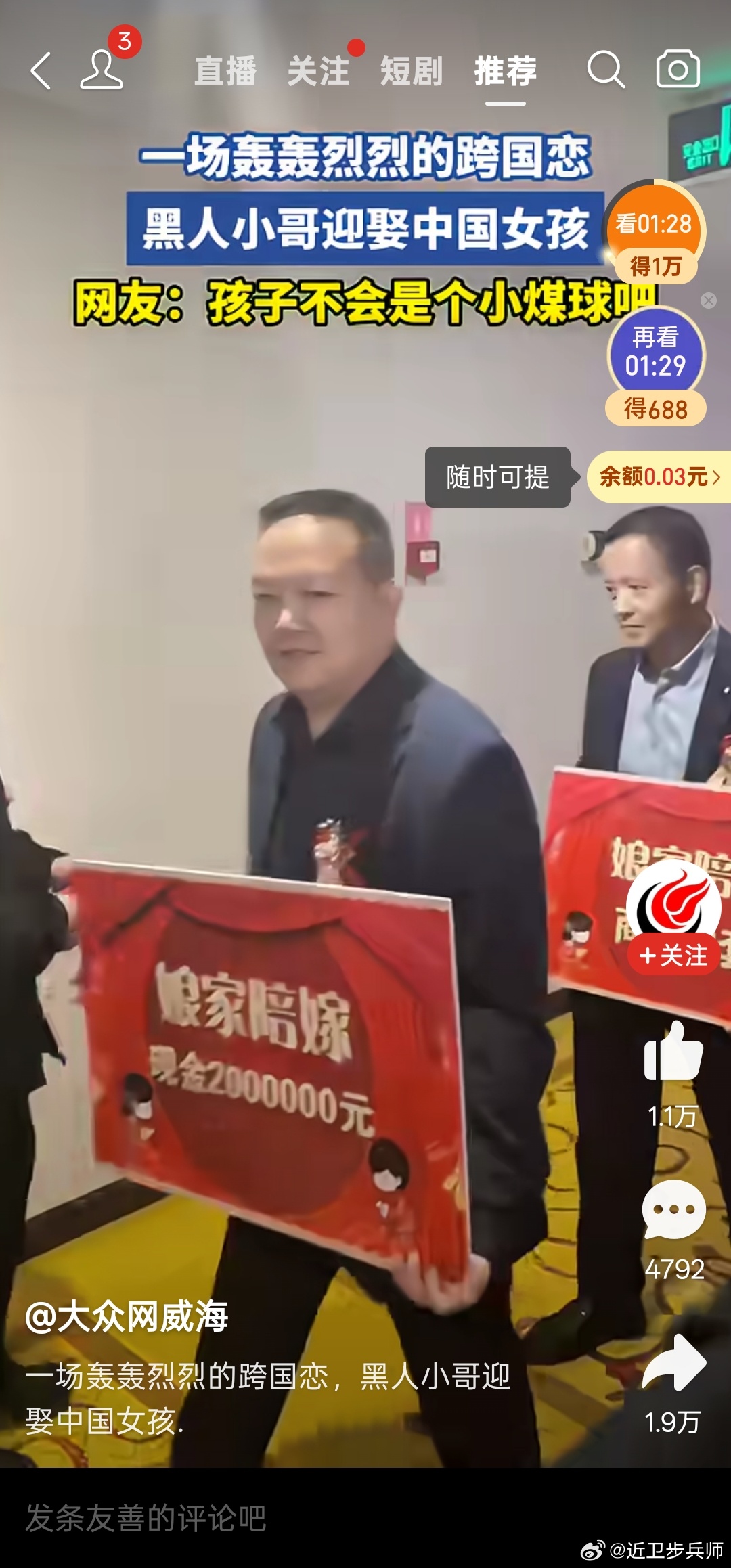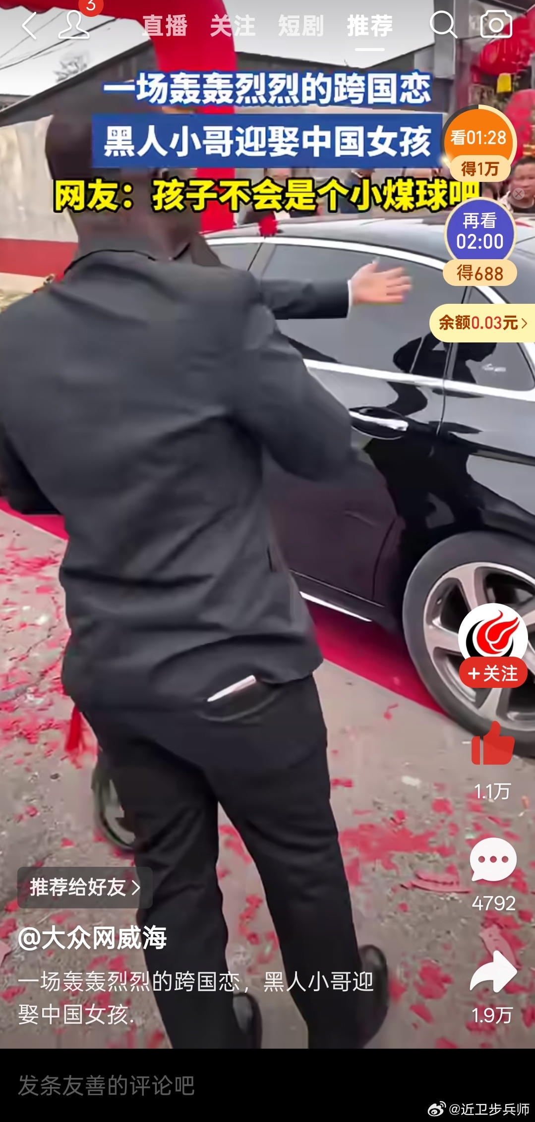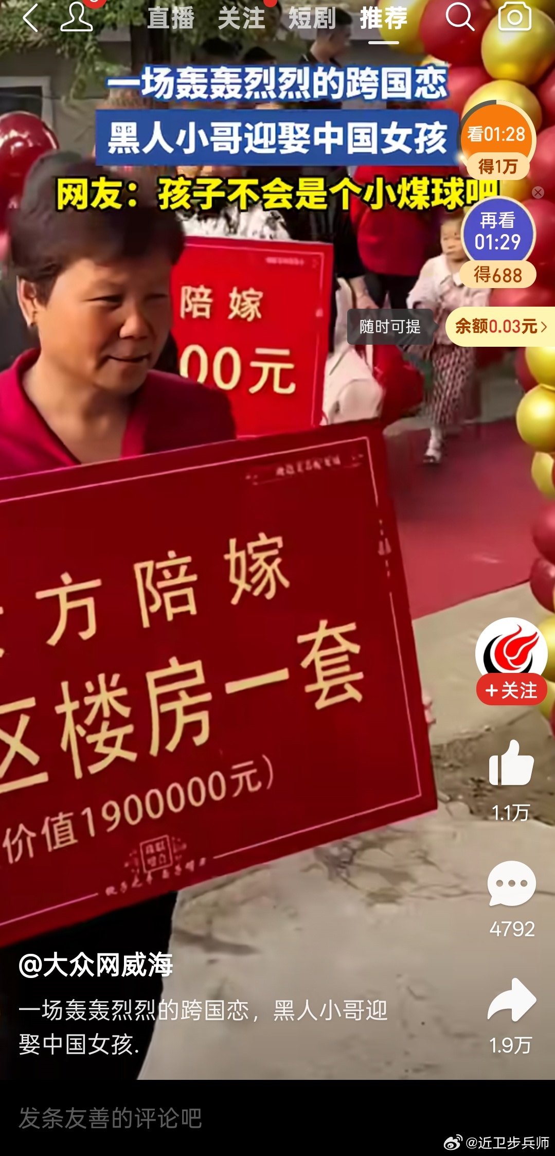 黑人娶中国女,网传娘家陪嫁:现金多少万,数字太大了,大家数吧。楼房一套,A7轿跑一辆,从头到尾没看到黑人提供任何钱,车,房。视频发布者:大众网威海。是不是威海那边的?有没有人去查证一下,到底真的假的?
