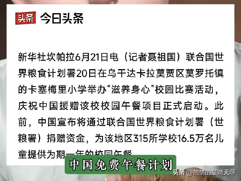 中国免费营养午餐出海计划! 中国通过联合国世界粮食计划署捐赠资金,在乌干达315所学校为16.5万名儿童提供为期一年的校园午餐。此外,该计划还覆盖了非洲的肯尼亚、坦桑尼亚、马拉维、尼日利亚、埃塞俄比亚、纳米比亚等国,以及亚洲的菲律宾、缅甸、尼泊尔、柬埔寨、老挝和蒙古国等,累计超百万孩子受益,这一公益援助行动在各国收获了大量好评。 非洲发展援助 免费午餐