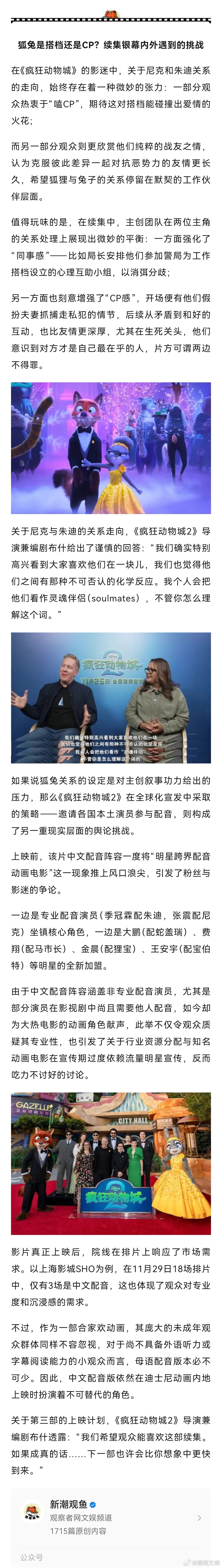 【从乌托邦到气候墙,疯狂动物城2用童话讲全球化之困?】导演说疯狂动物城第3部也许更快到来尽管续集少了第一部横空出世时,在构建动物乌托邦世界观和设定现实世界隐喻层面所带来的那种惊艳感,但《疯狂动物城2》依然是一部在冬天能看得人暖洋洋的合格续作。该系列最棒的地方,就是观众能笑着、安心、轻松地,把现实里的麻烦事儿看得一清二楚。
