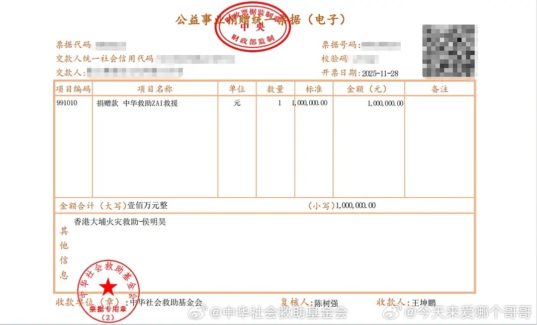 灾难无情,人有情,侯明昊为香港捐款100万用于家园重建,愿平安