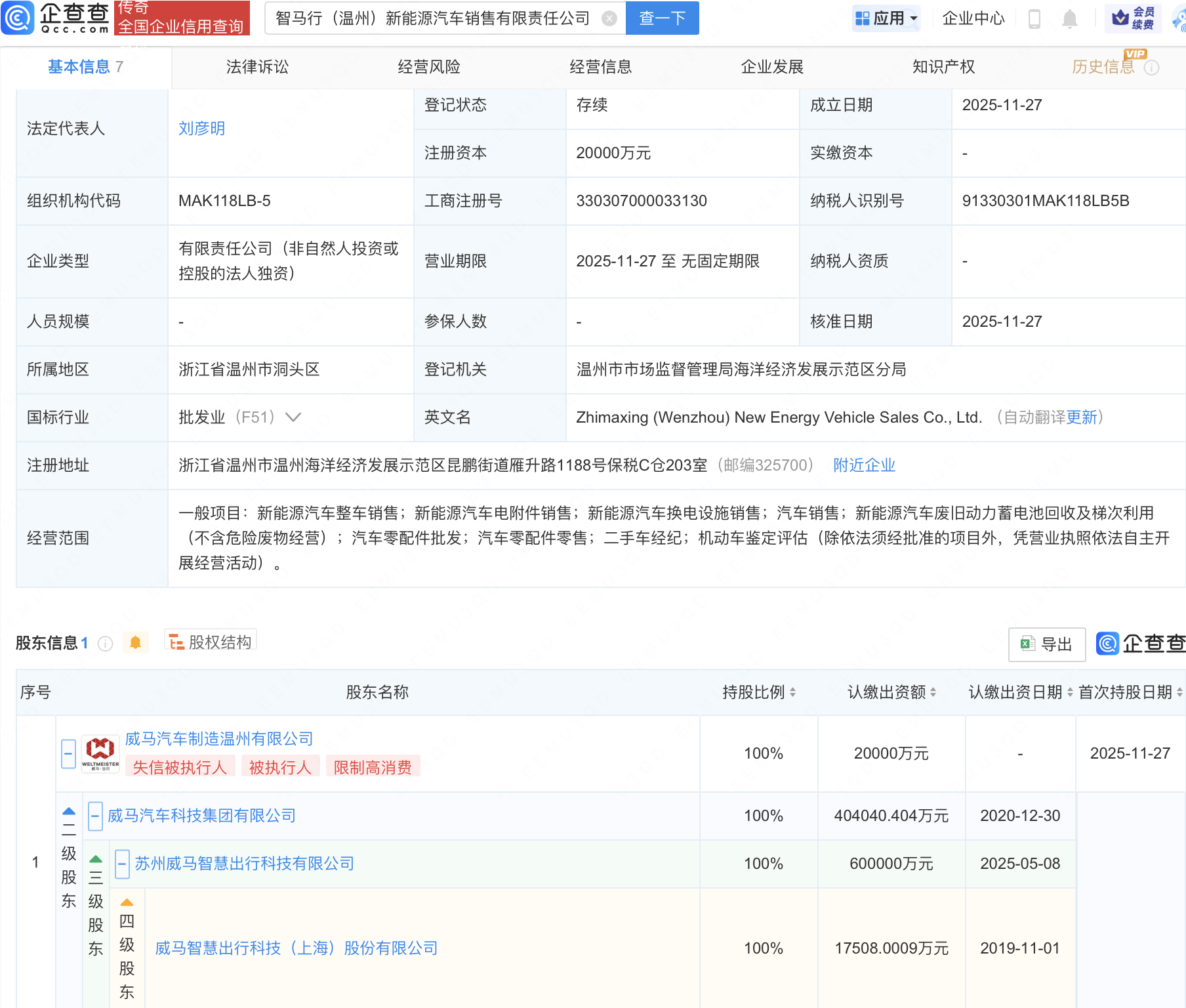 企查查APP显示,近日,智马行(温州)新能源汽车销售有限责任公司成立,法定代表人为刘彦明,注册资本2亿人民币,经营范围包括新能源汽车整车销售、新能源汽车电附件销售、新能源汽车换电设施销售等。企查查股权穿透显示,该公司由威马智慧出行科技(上海)股份有限公司间接全资持股。