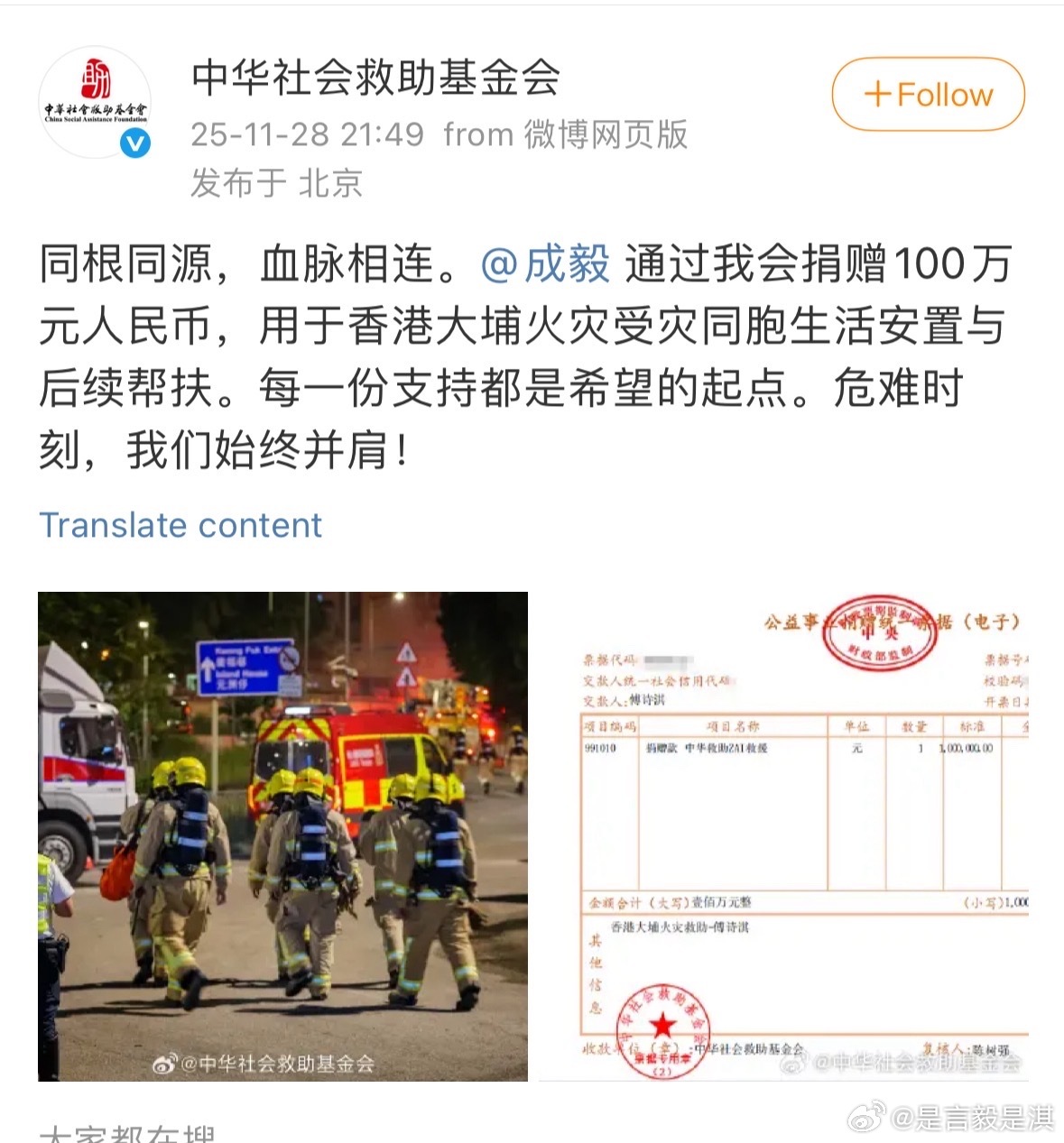 成毅捐赠100万 cy 成毅 成毅永远是一个行动大过于说的人,他的心细藏在行动力,此番通过中华社会救助基金会捐赠100万驰援香港。香港火灾牵动全国人民的心,我们也跟成毅一起去贡献一份心意,愿平安、愿一切顺利。