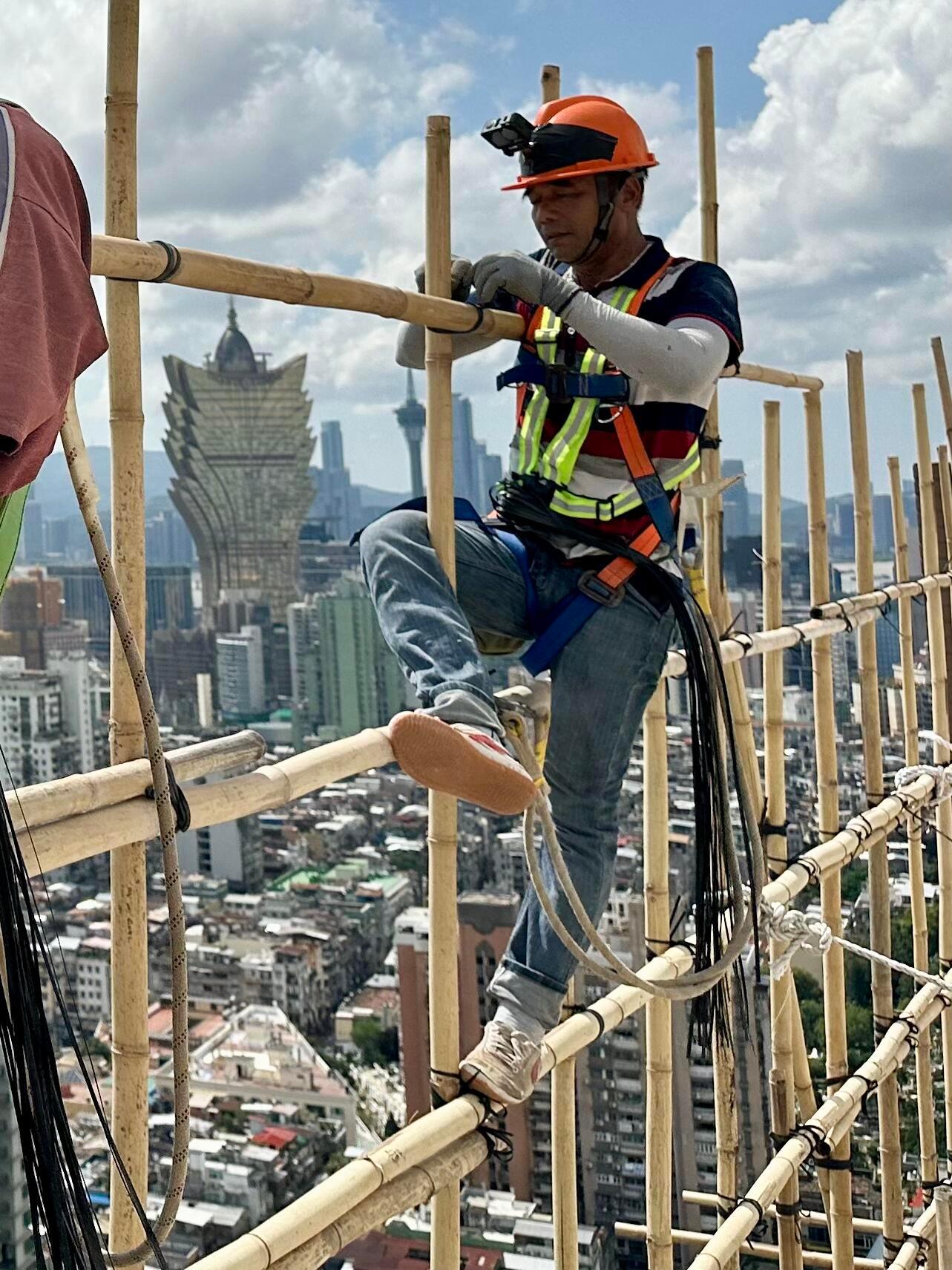 最后吐烟头的动作,解释了一切…香港都是这种竹子的脚手架,工作量很大,容易着火,