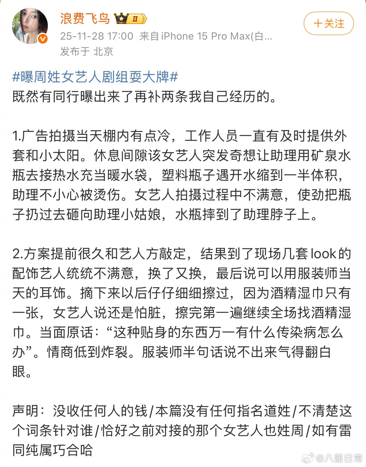 2025年11月28日,一则关于“周姓女艺人剧组耍大牌”的匿名爆料引发全网热议,
