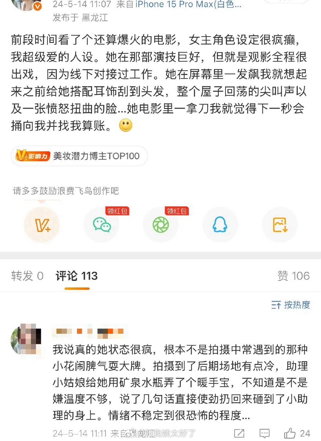 脾气不好的周姓女艺人还有其他人出来爆料了,随时发疯随机创亖一个打工人。