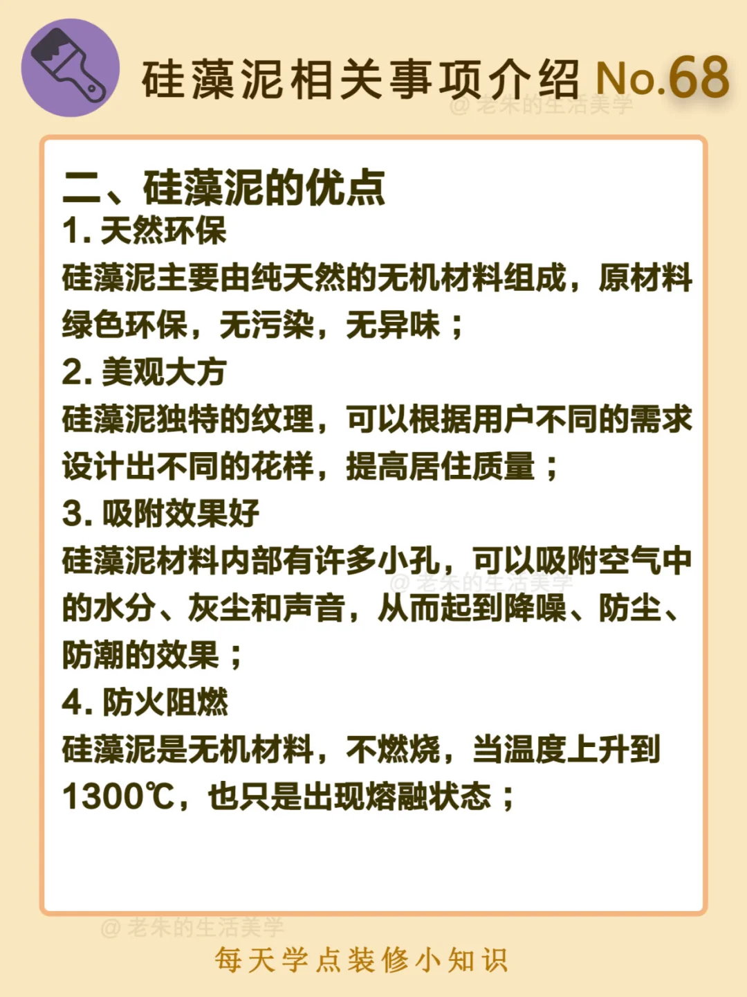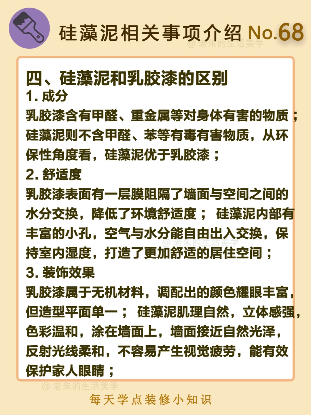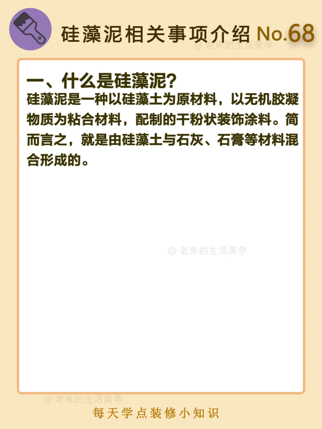 🔔 一、什么是硅藻泥? 硅藻泥是一种以硅藻土为原材料,以无机胶凝物质为粘合材料,配制的干粉状装饰涂料。简而言之,就是由硅藻土与石灰、石膏等材料混合形成的。 二、硅藻泥的优点 三、硅藻泥的缺点 四、硅藻泥和乳胶漆的区别 🔆 我是老朱 📍坐标天津 前上市公司金牌工长🏅 30年施工经验🛠️ 承接天津新房装修/老房改造 精心整理关于设计&施工&装修的攻略📝 关注我每日更新🗓️ 也可以在评论区留下您宝贵的想法与建议💓 让您装修不走弯路✅