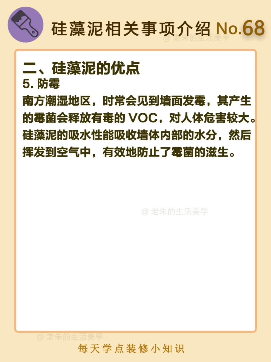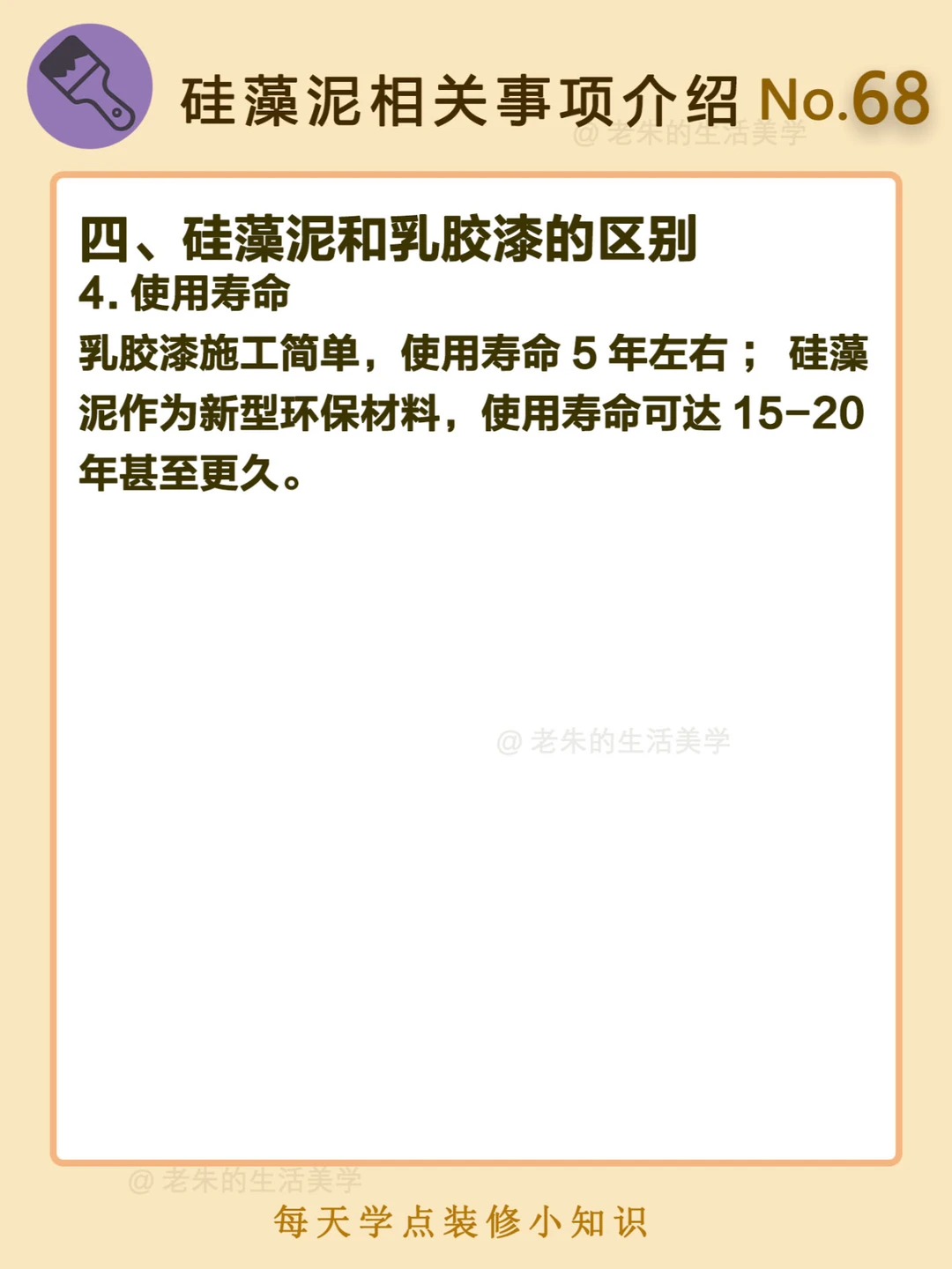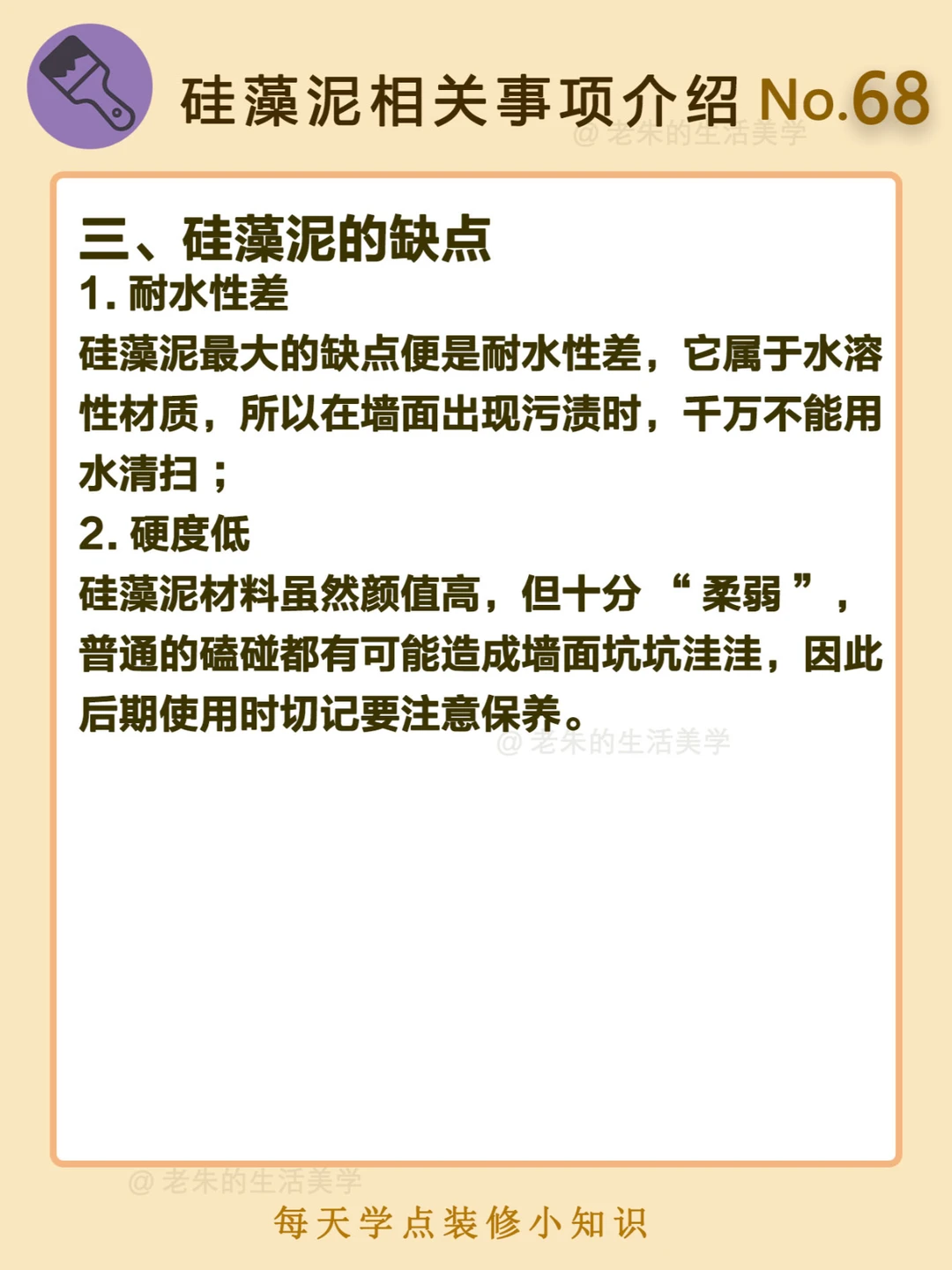 🔔 一、什么是硅藻泥? 硅藻泥是一种以硅藻土为原材料,以无机胶凝物质为粘合材料,配制的干粉状装饰涂料。简而言之,就是由硅藻土与石灰、石膏等材料混合形成的。 二、硅藻泥的优点 三、硅藻泥的缺点 四、硅藻泥和乳胶漆的区别 🔆 我是老朱 📍坐标天津 前上市公司金牌工长🏅 30年施工经验🛠️ 承接天津新房装修/老房改造 精心整理关于设计&施工&装修的攻略📝 关注我每日更新🗓️ 也可以在评论区留下您宝贵的想法与建议💓 让您装修不走弯路✅
