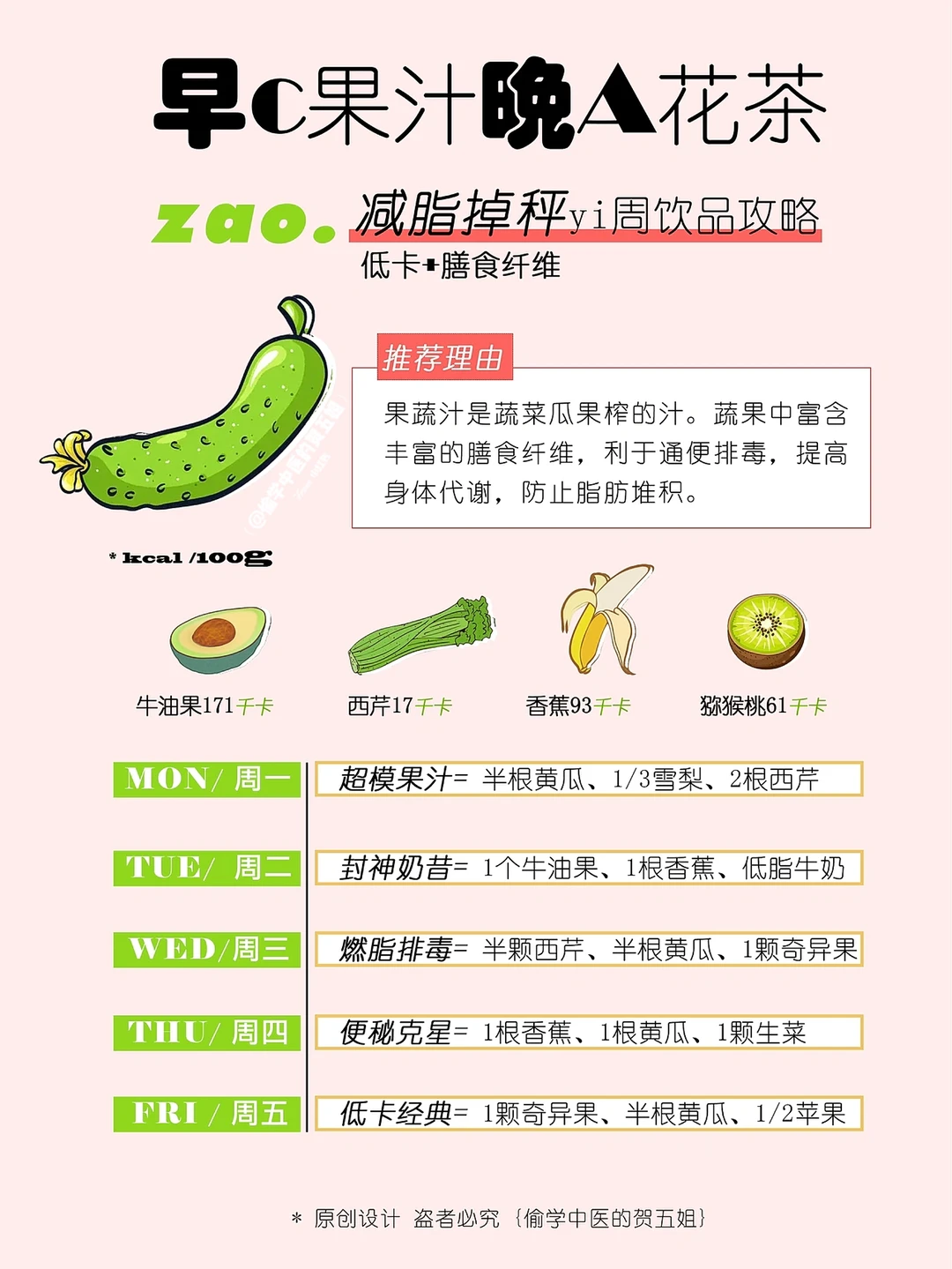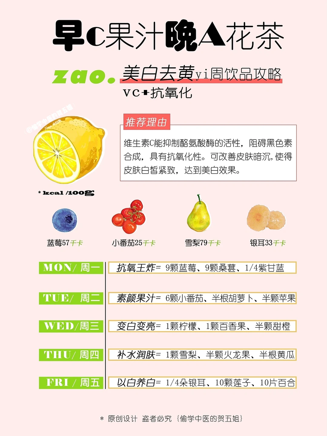 “早C晚A”是美白界的传奇定律,被称作神仙抗老组合…今天分享一个一周不重样的花式内调攻略,20款早C蔬果饮➕晚A花茶[吧唧R][吧唧R]偷偷喝起来,在这个夏天当一个白到反光的瘦瘦子吧~