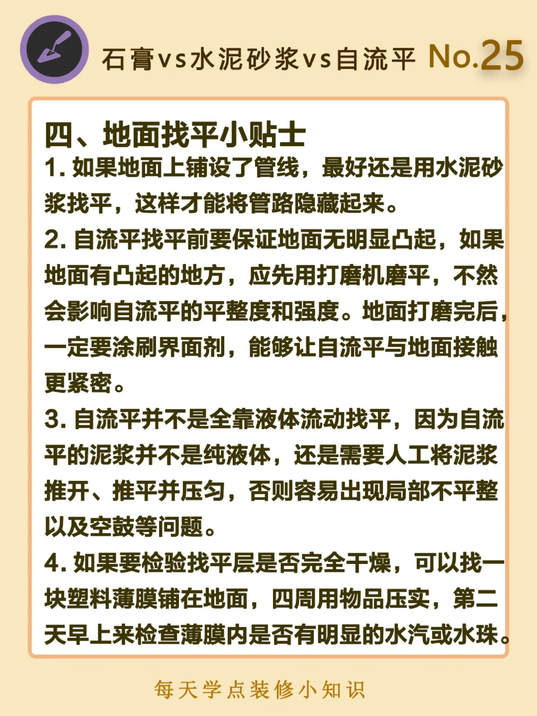 3.自流平并不是全靠液体流动找平,因为自流平的泥浆并不是纯液体,还是需要人工将泥浆推开、推平并压匀,否则容易出现局部不平整以及空鼓等问题。