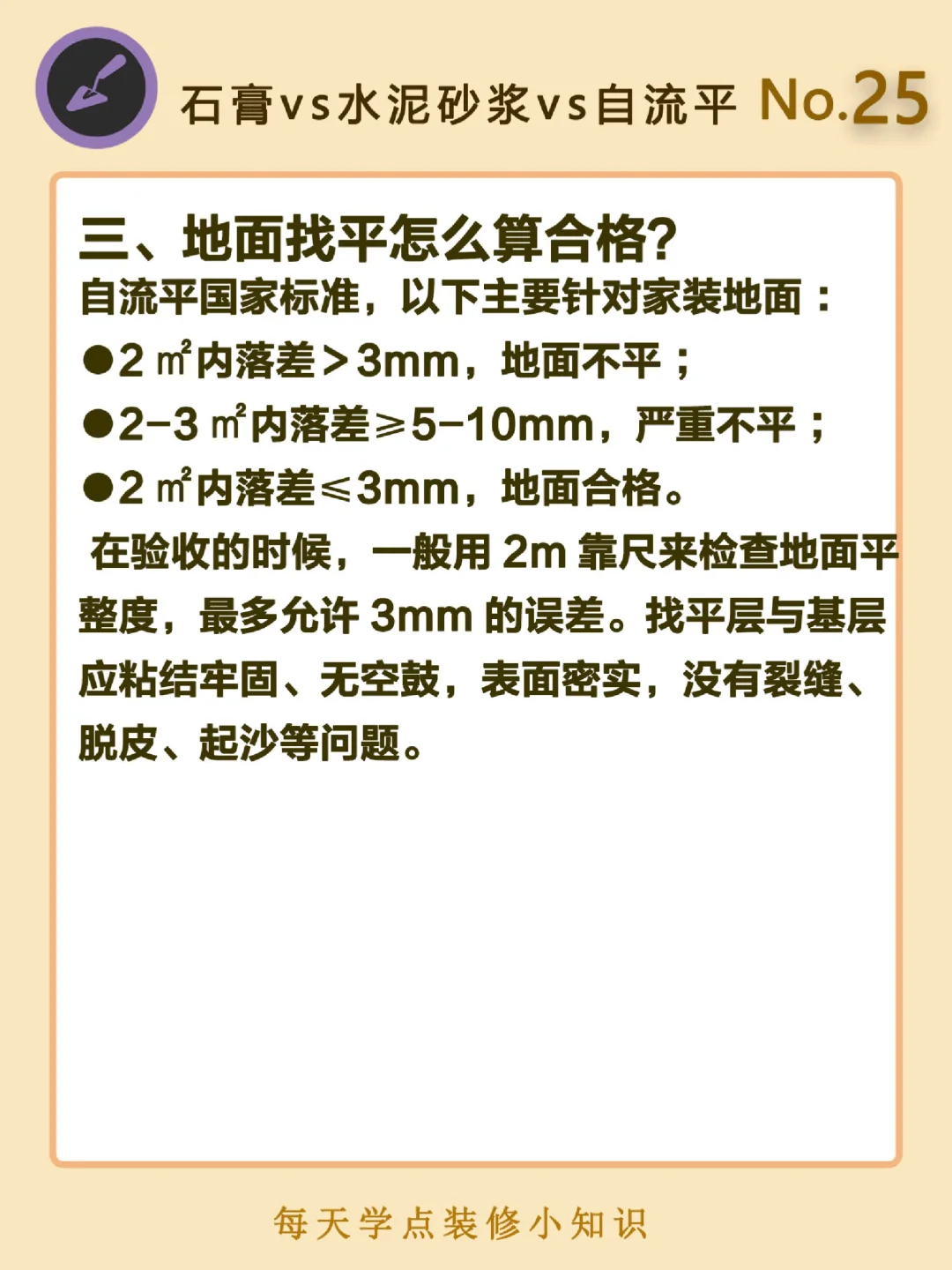 自流平国家标准,以下标准主要针对家装地面:●2㎡内落差>3mm,地面不平;●2-3㎡内落差≥5-10mm,严重不平;●2㎡内落差≤3mm,地面合格。 在验收的时候,一般用2m靠尺来检查地面平整度,最多允许3mm的误差。找平层与基层应粘结牢固、无空鼓,表面密实,没有裂缝、脱皮、起沙等问题。