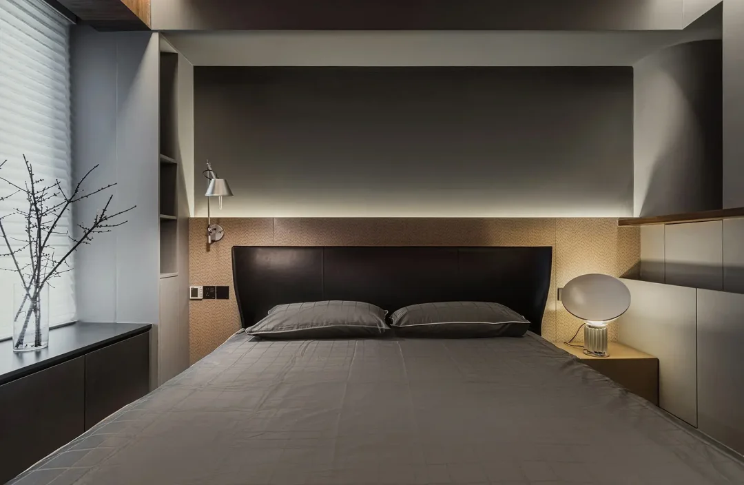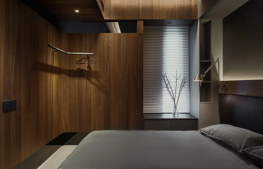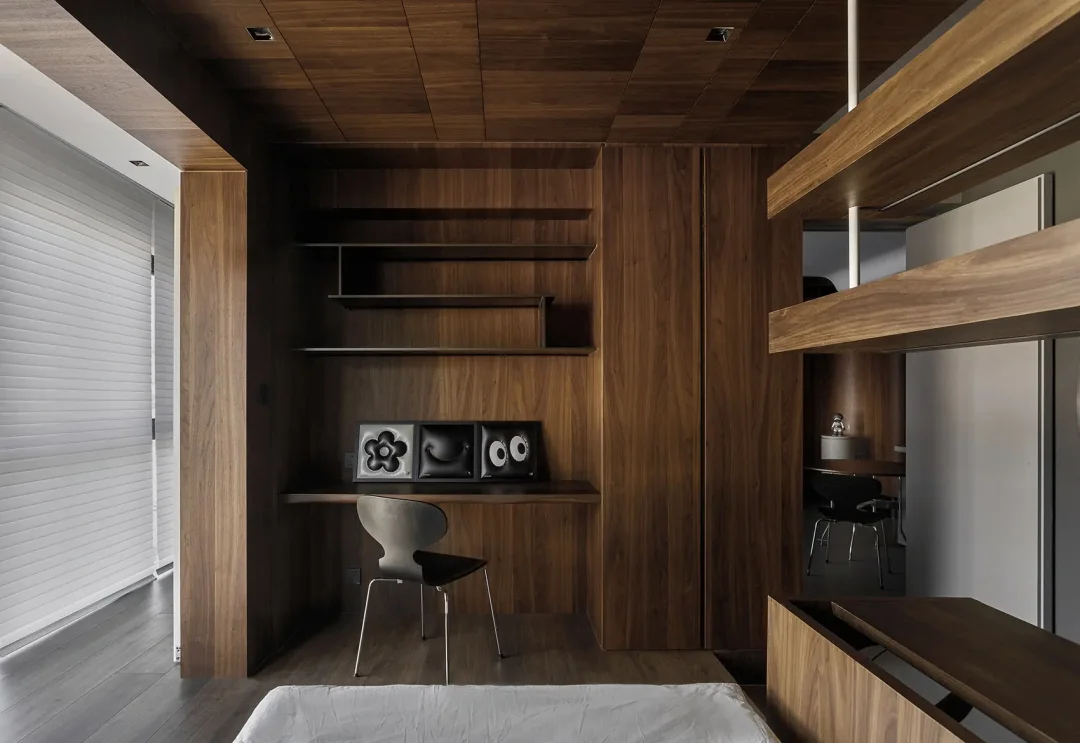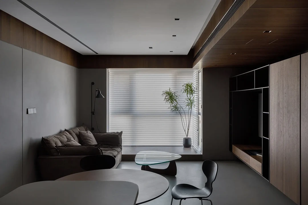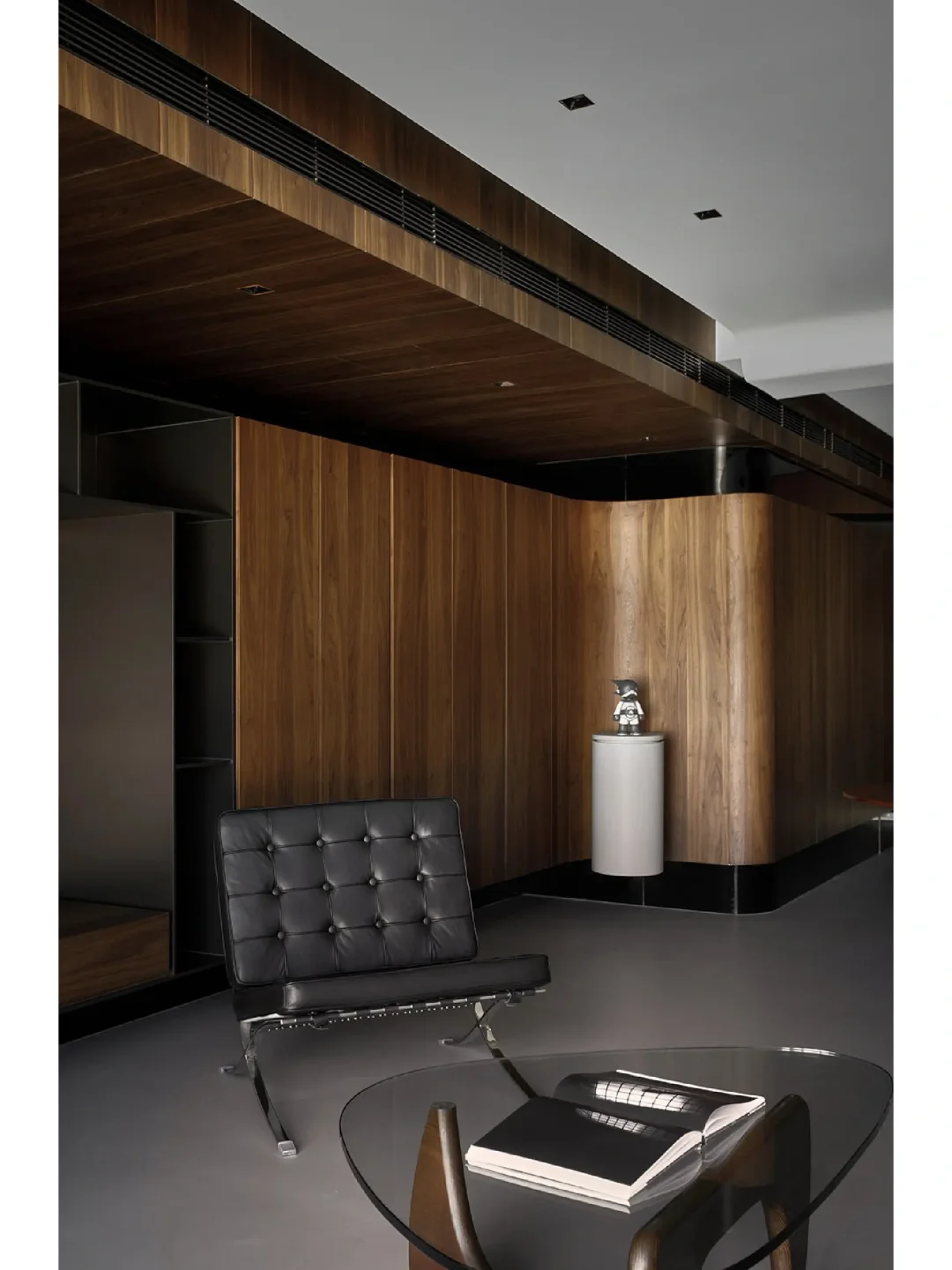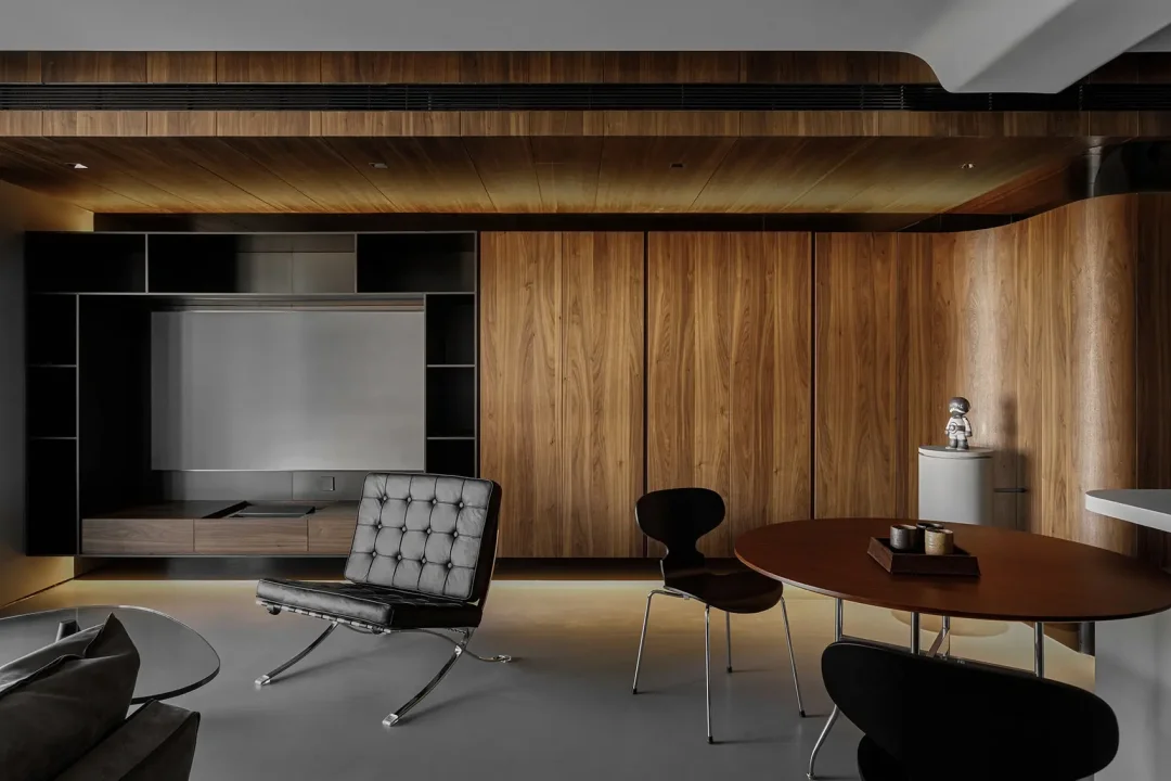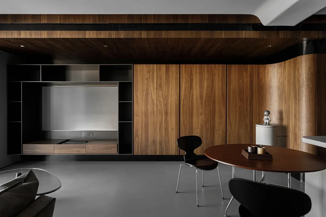🌿微水泥和胡桃木为空间定调,辅以玻璃、不锈钢等串联空间。进门始,由木质弧形墙面和天花引导步入空间,再到客餐厅顺延至小孩房内,木饰面得到完整释放。