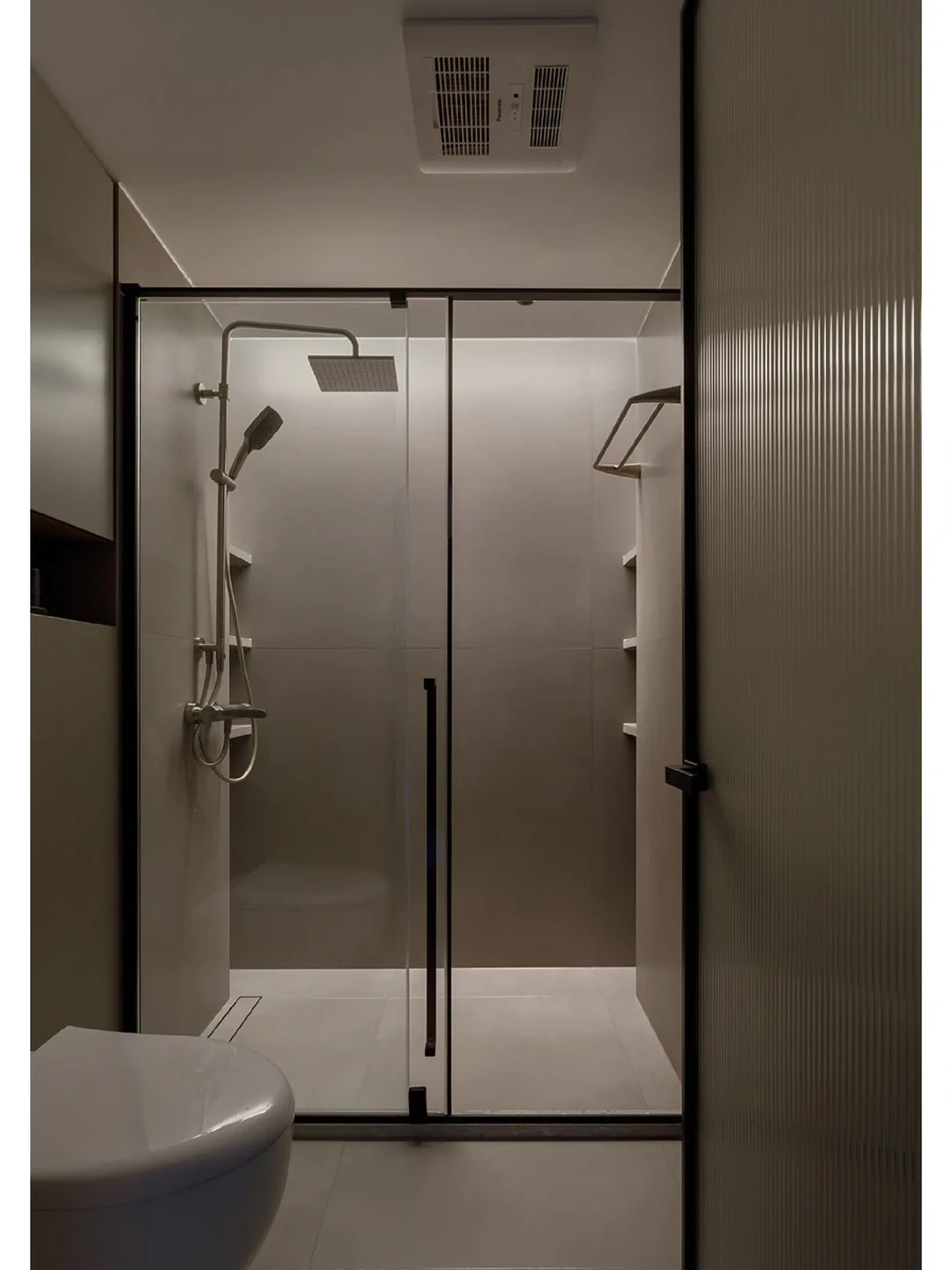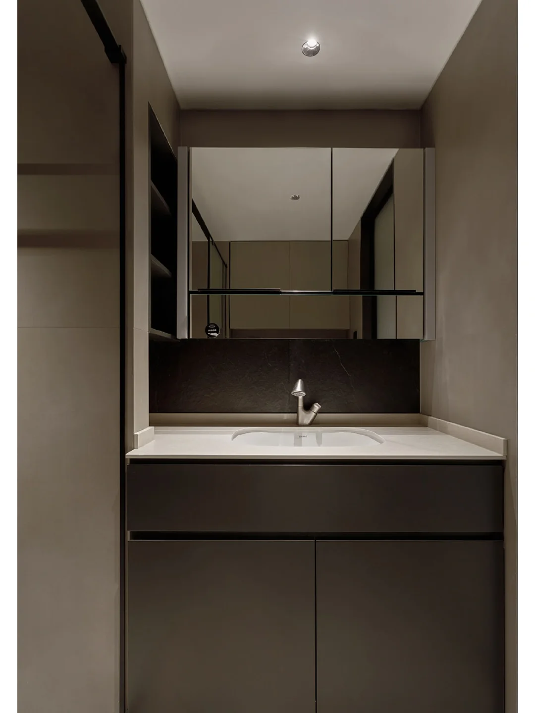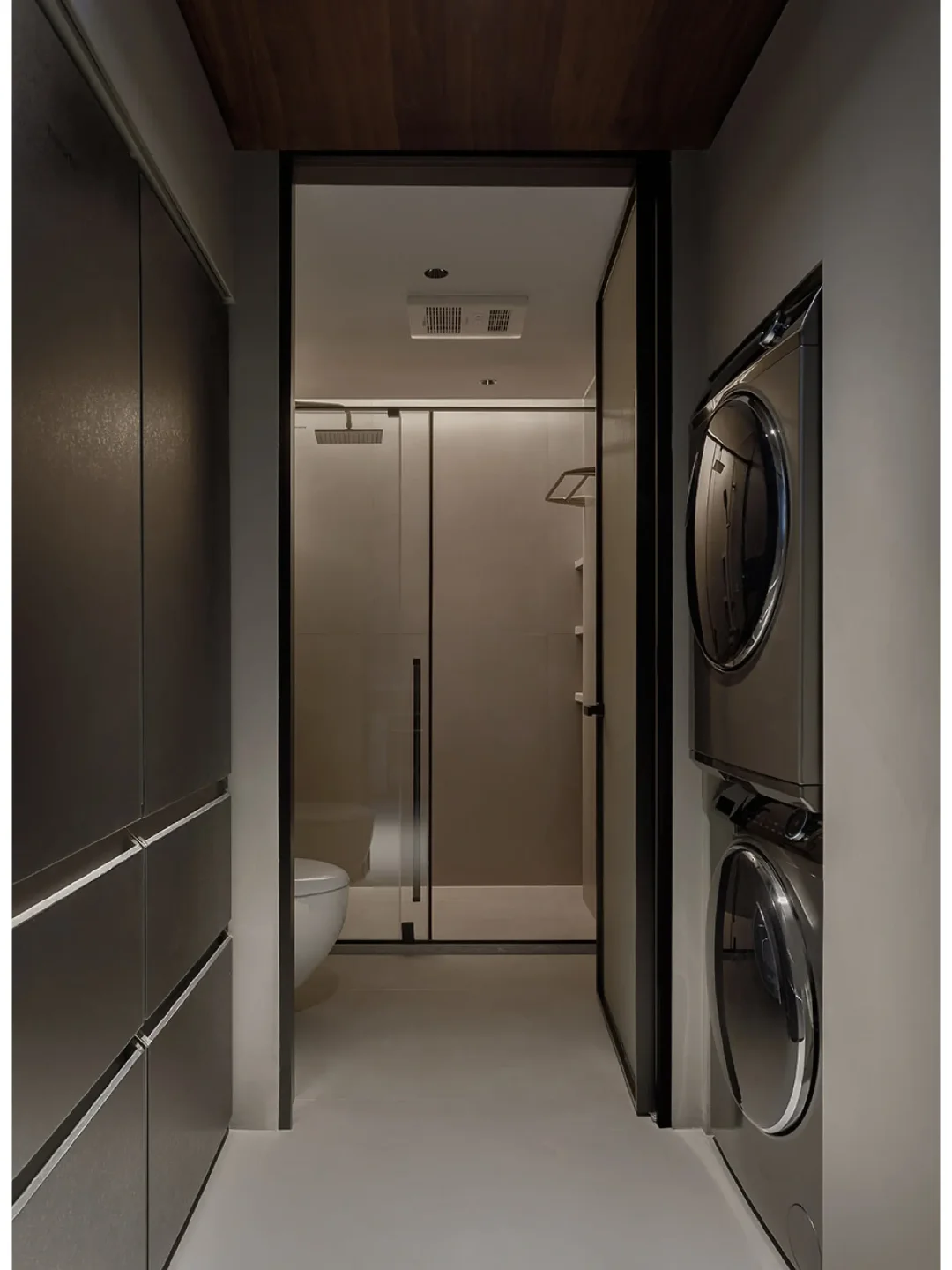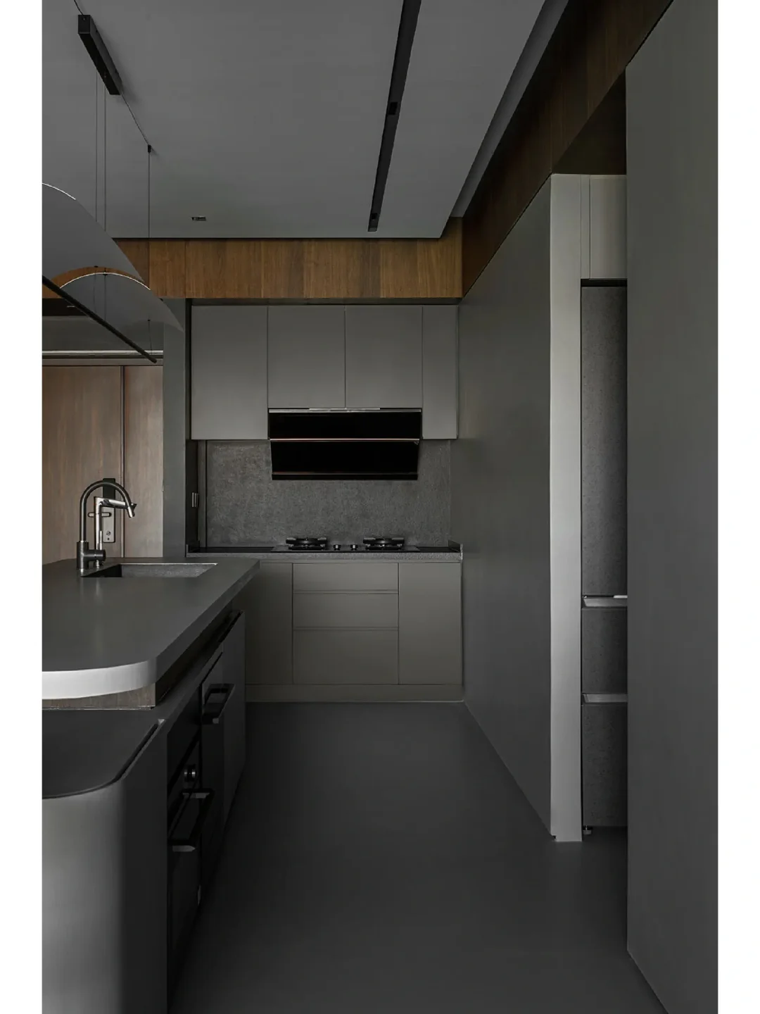 🌿功能划分上,舍弃原本独立厨房,成就独立卧房,随之而来的课题是完善厨房功能。进门第一段是长岛台,综合了洗手池、洗碗机、储物柜、电源等功能,既满足业主对岛台的需求,也串联了两个卧房,形成自由的环绕动线。