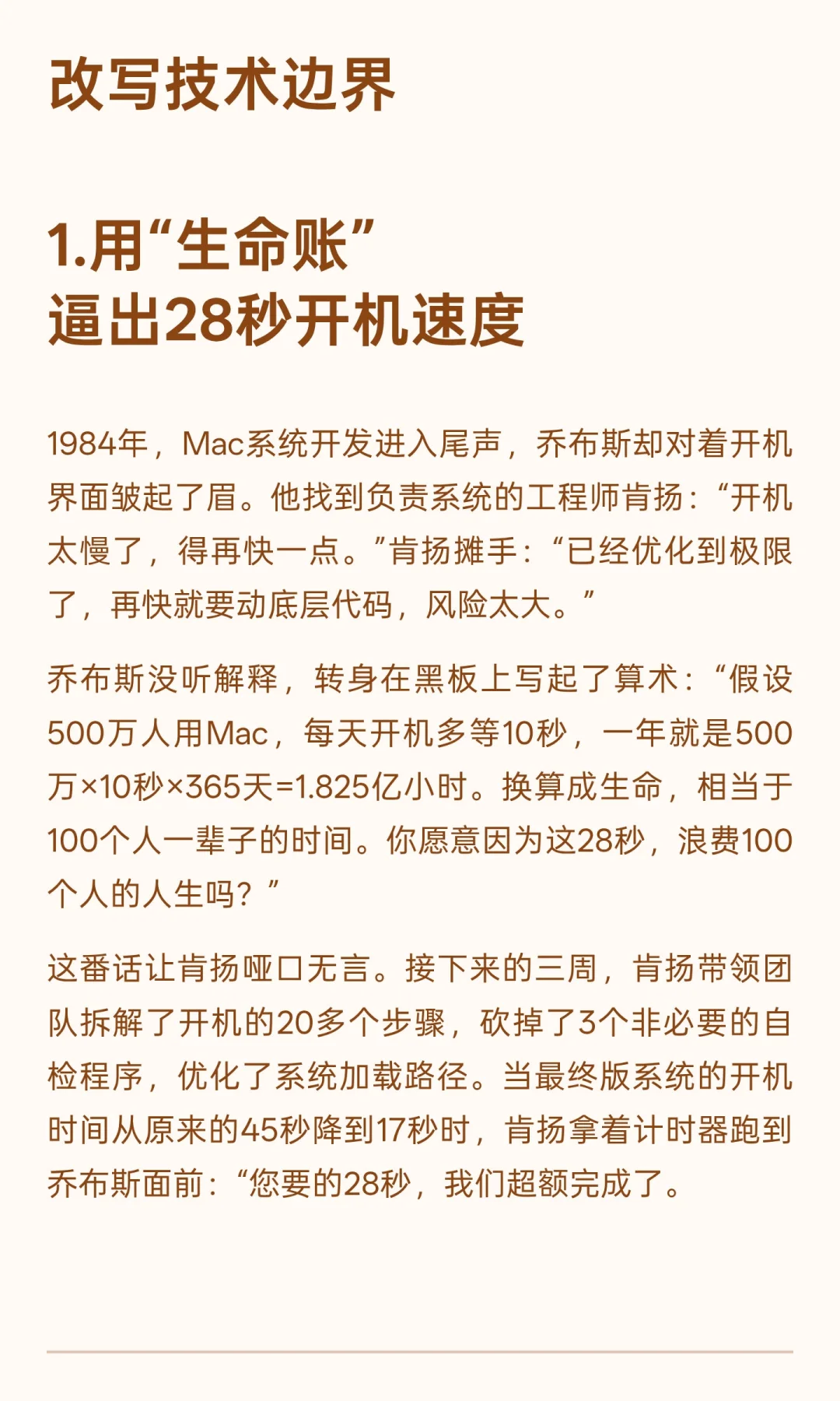 乔布斯没听解释,转身在黑板上写起了算术:“假设500万人用Mac,每天开机多等10秒,一年就是500万×10秒×365天=1.825亿小时。换算成生命,相当于100个人一辈子的时间。你愿意因为这28秒,浪费100个人的人生吗?”