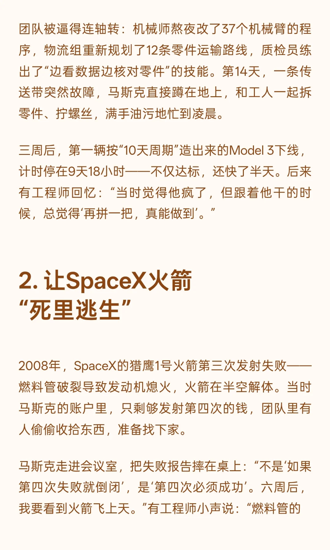 三周后,第一辆按“10天周期”造出来的Model 3下线,计时停在9天18小时——不仅达标,还快了半天。后来有工程师回忆:“当时觉得他疯了,但跟着他干的时候,总觉得‘再拼一把,真能做到’。”