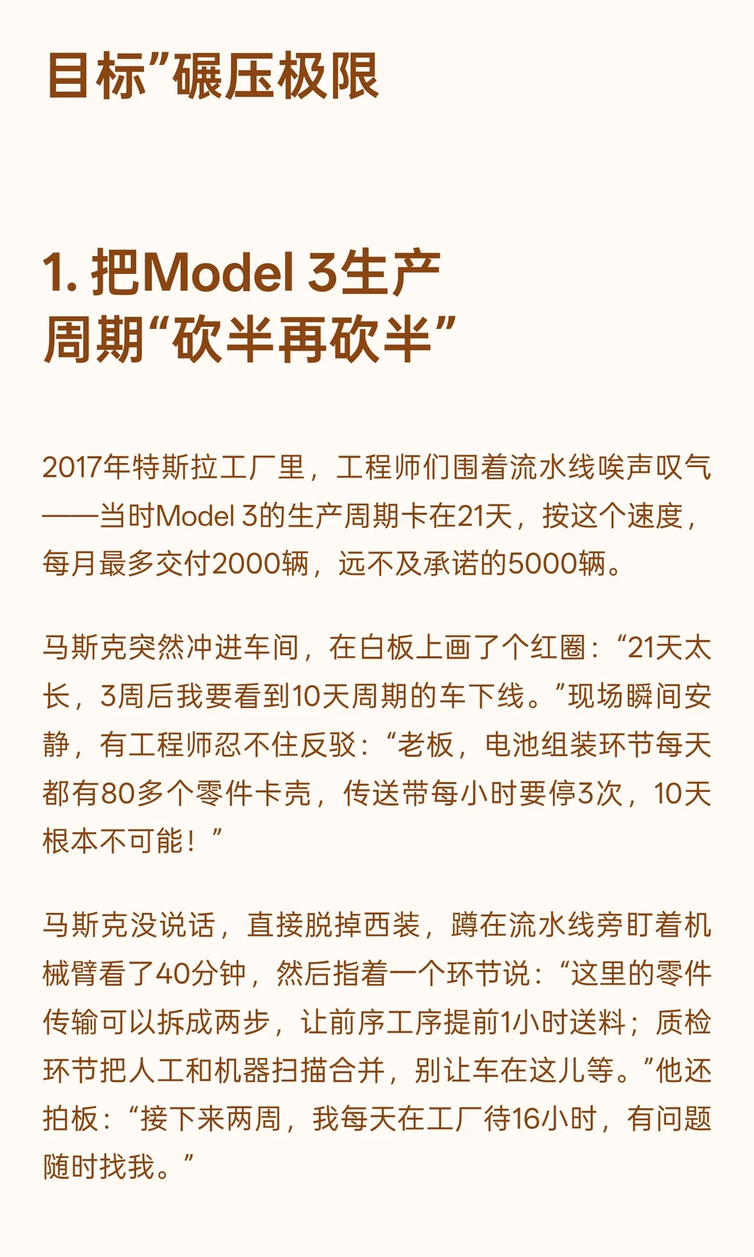 1. 把Model 3生产周期“砍半再砍半”