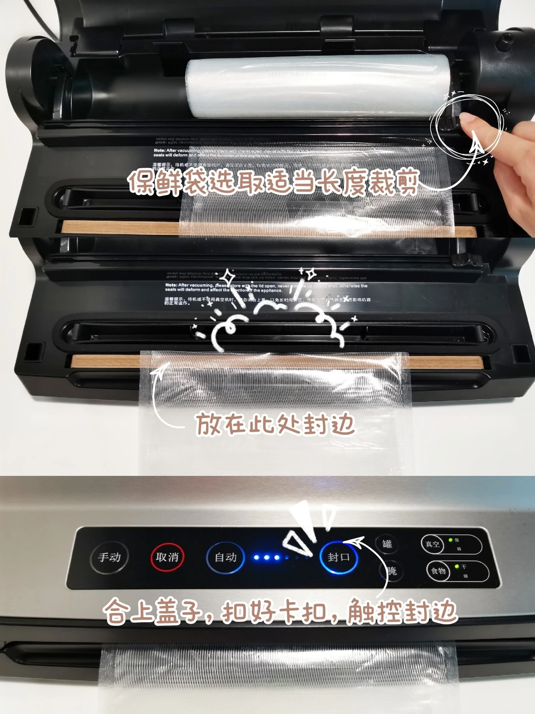 💡Tips:市面上其他牌子的真空袋都能使用,用过的袋子切割后可以重复使用,不要浪费哦~