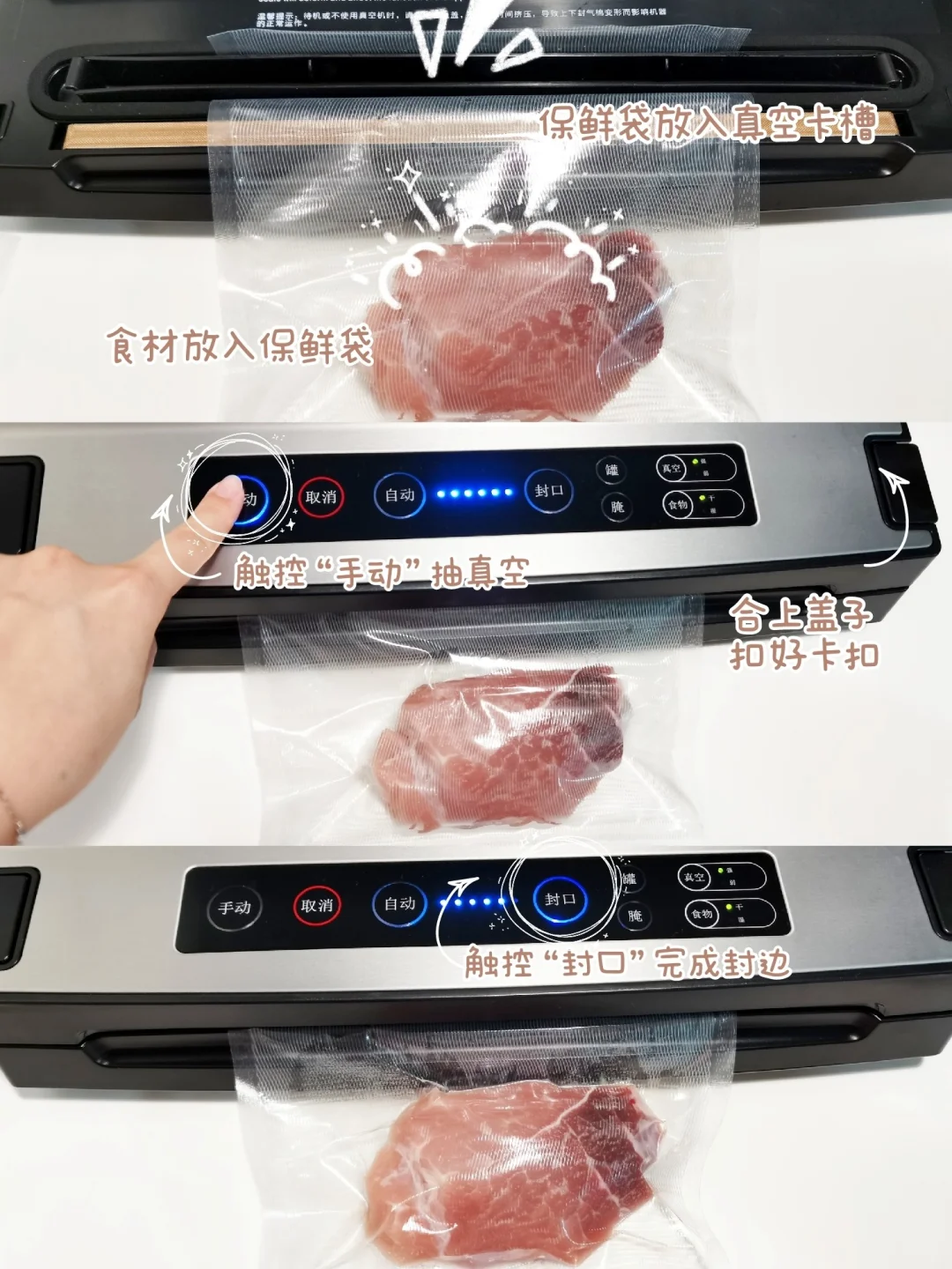 ☑️步骤3:把食材放到真空袋里,袋口放在真空卡槽,合上盖子扣上卡扣
