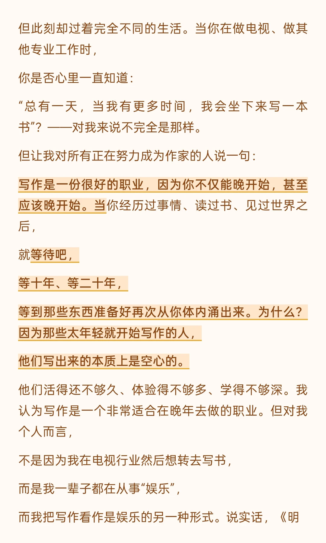 他们活得还不够久、体验得不够多、学得不够深。我认为写作是一个非常适合在晚年去做的职业。
