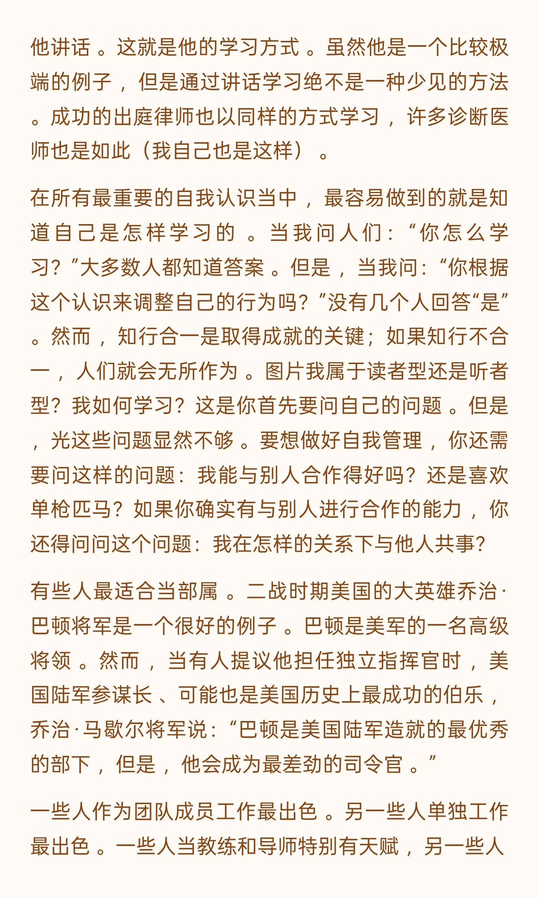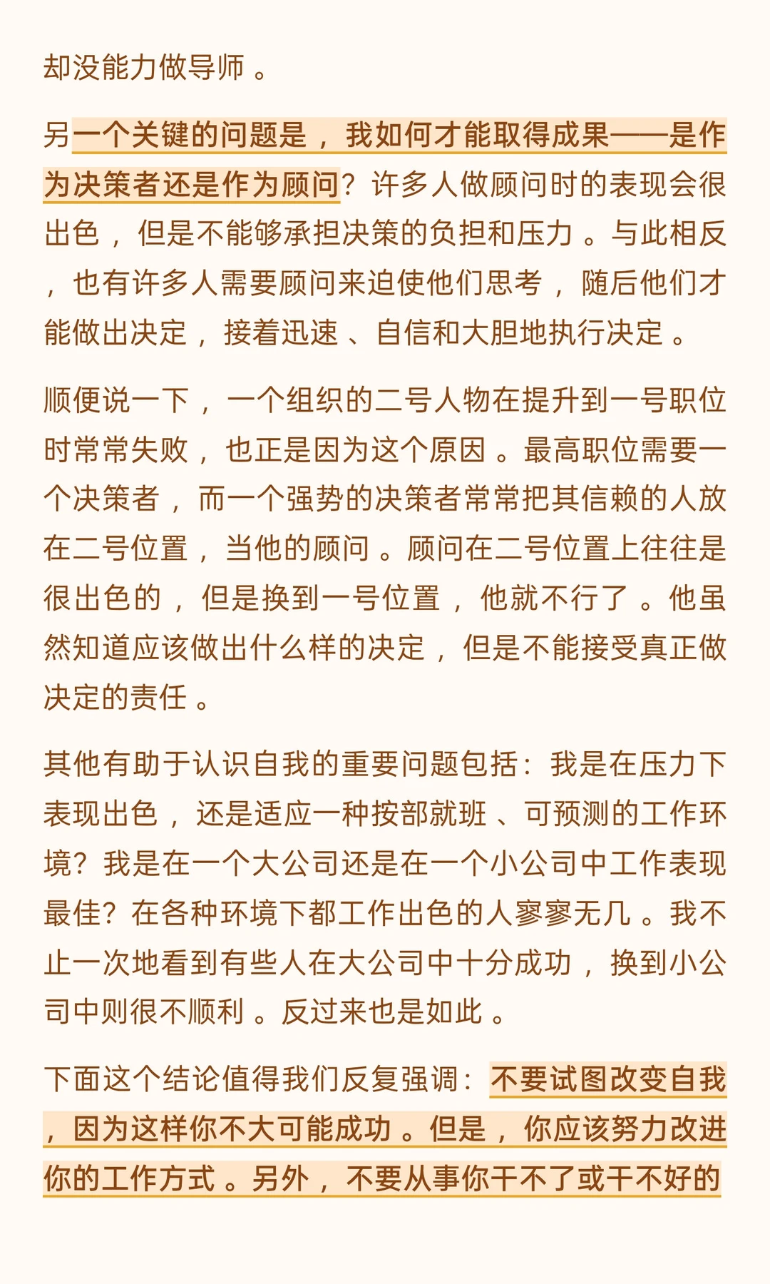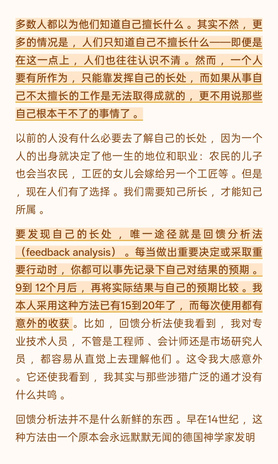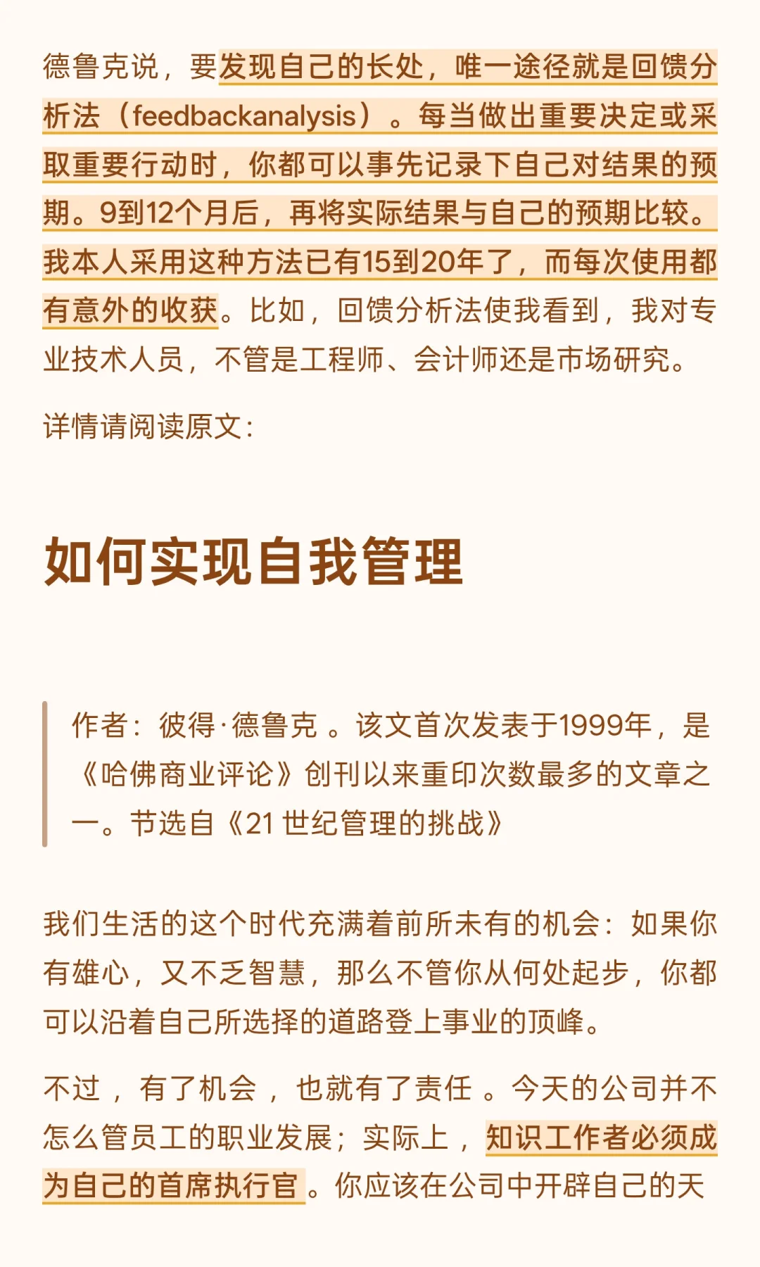 德鲁克 26 年前写了一篇文章《如何实现管理自我》,提出了一个认识自己、评估自己长短处的好办法,叫回馈分析法。