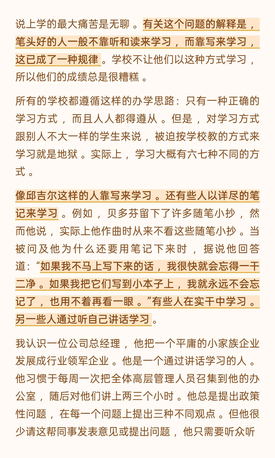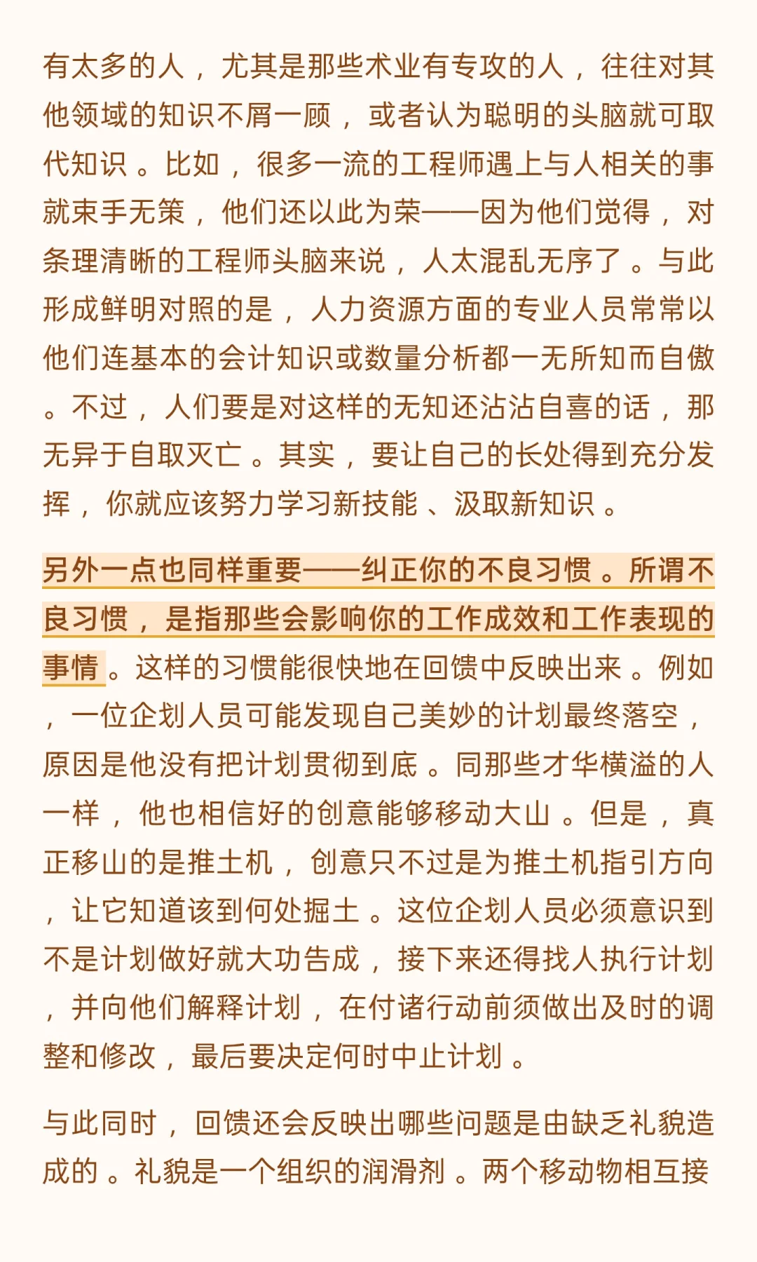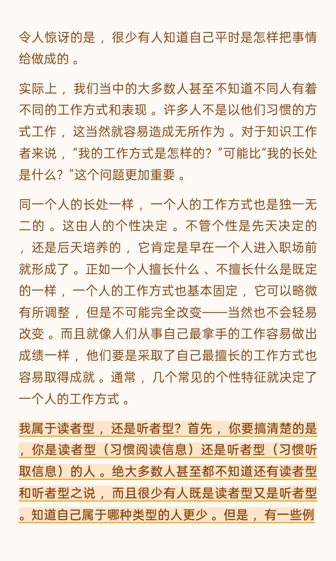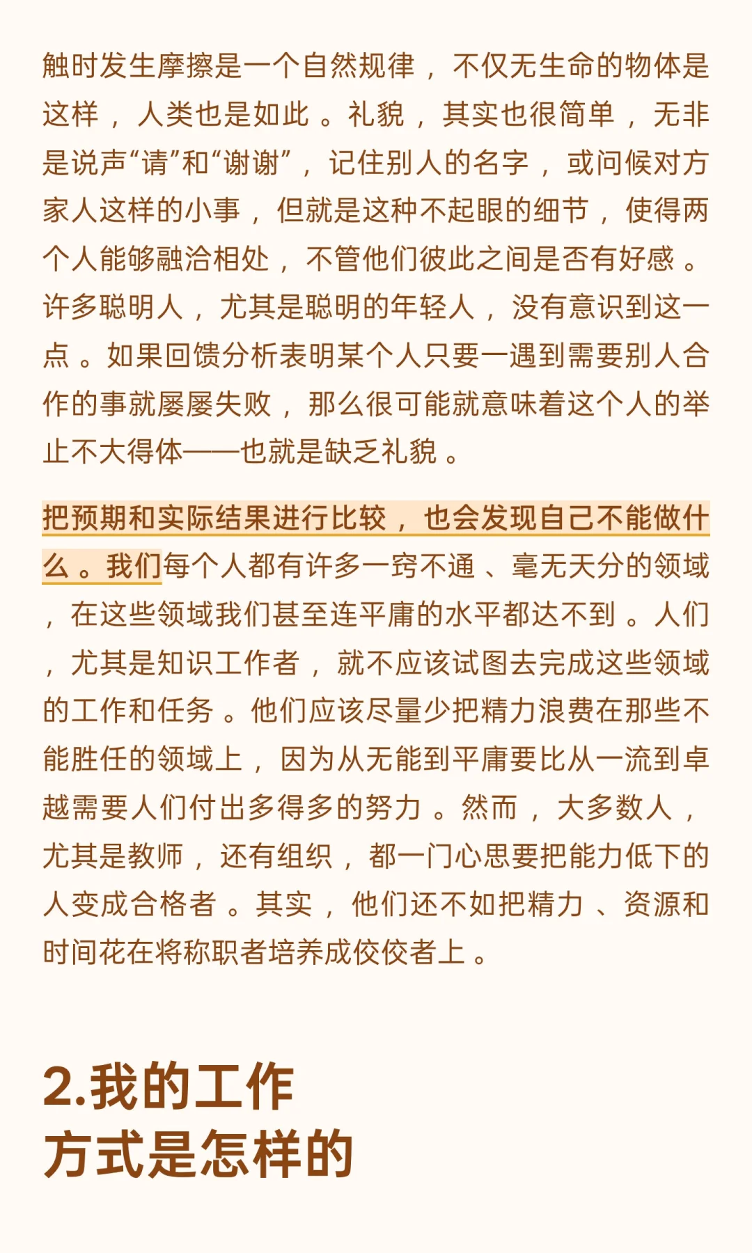 德鲁克说,要发现自己的长处 ,唯一途径就是回馈分析法(feedback analysis) 。每当做出重要决定或采取重要行动时 ,你都可以事先记录下自己对结果的预期 。9到 12个月后 ,再将实际结果与自己的预期比较 。我本人采用这种方法已有15到20年了 ,而每次使用都有意外的收获 。比如 ,回馈分析法使我看到 ,我对专业技术人员 ,不管是工程师 、会计师还是市场研究。
