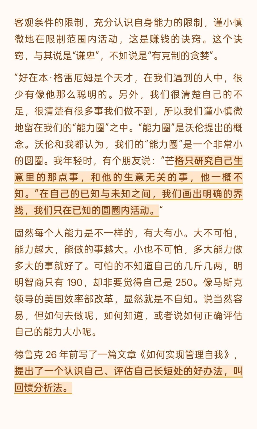 查理芒格:”有时候,只有经过失败的历练,我们才能懂得谦卑。用“谦卑”这个词也许不太恰当,可能用“务实”这个词更合适。我们能取得今时今日的成就,不是因为我们的能力比别人高出多少,而是我们比别人更清楚自己能力的大小。清楚自己能力的大小,这个品质应该不能说是“谦卑”。“