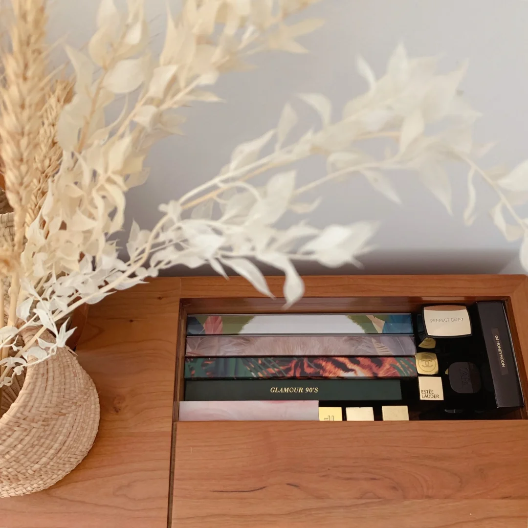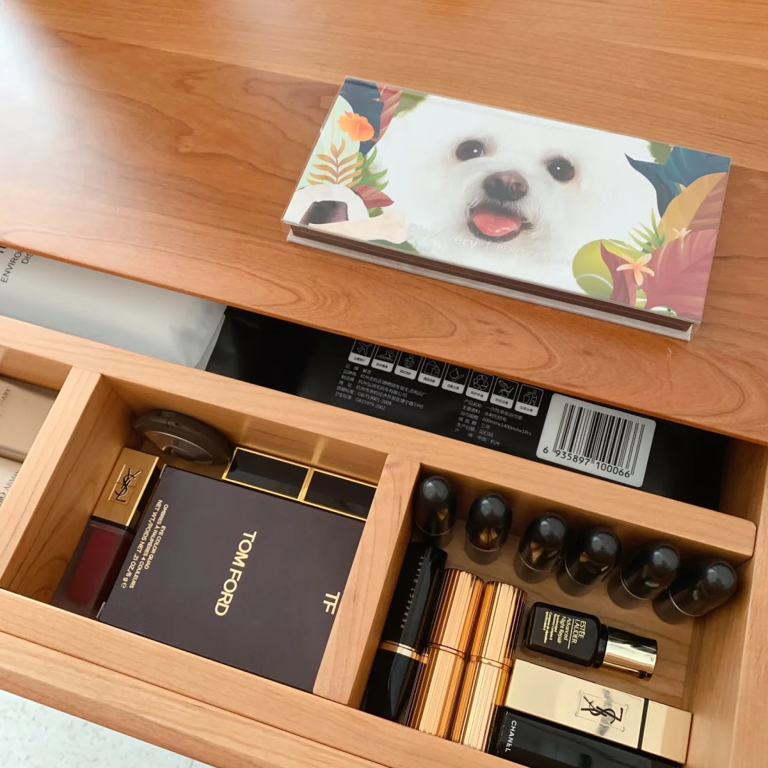 ✅左侧抽屉可以收纳彩妆,并分隔出小格子来,可以摆放口红。右侧抽屉可以收纳面膜、饰品等等。