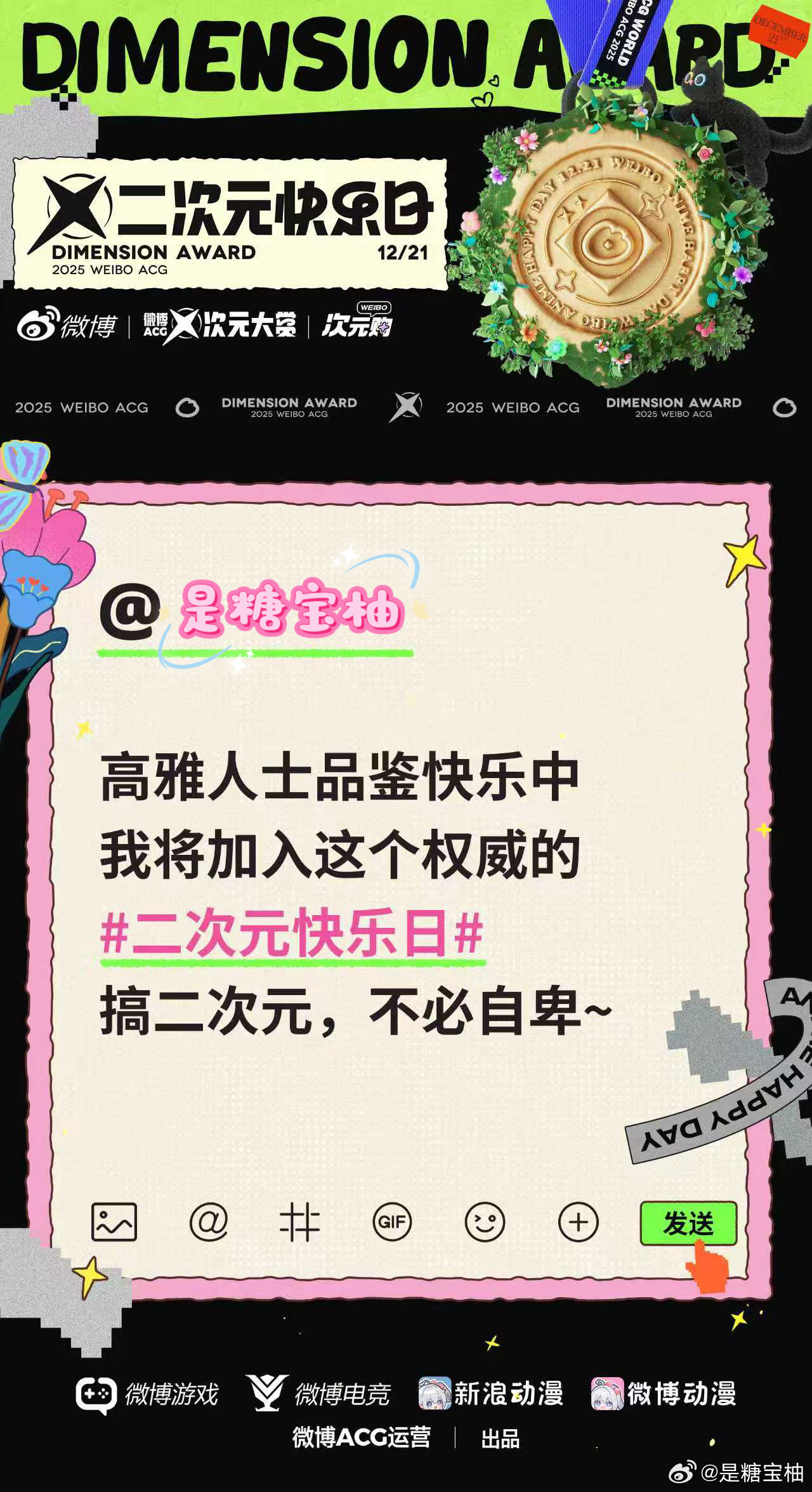 🎮【全体集合】2025 ACG次元大赏 正式开冲!🔥从今天到12月21日,微博二次元的狂欢正式开启!线上投票、线下漫展、独家周边、限定联动… 二次元的快乐,我们一次性给你拉满!你的本命作品、角色、CP,都在这里等你撑腰!二次元快乐日微博游戏大赏快来加入这场只属于我们的ACG盛宴,让热爱响彻次元!