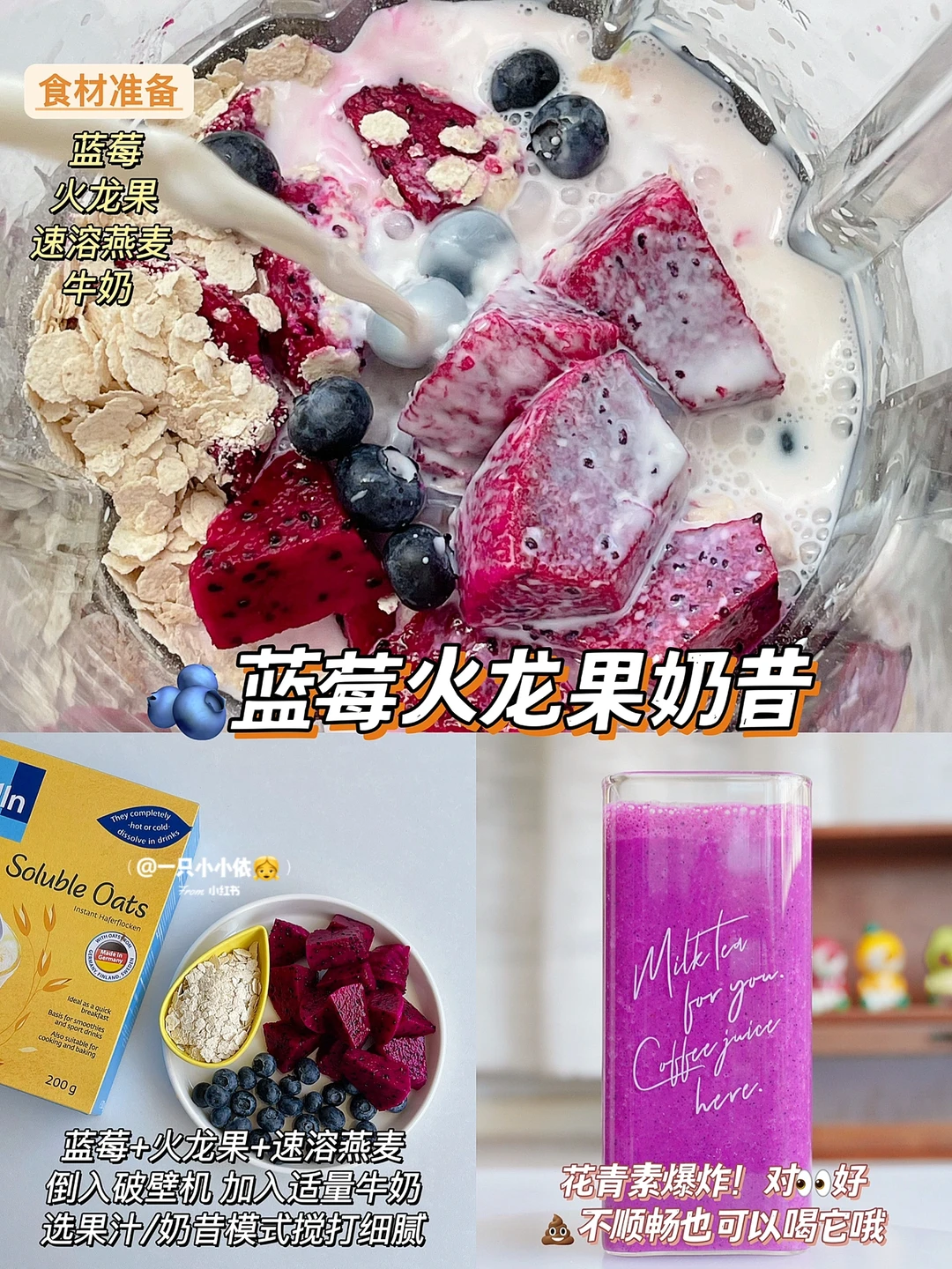 ✨食材:蓝莓+火龙果+速溶燕麦+牛奶
