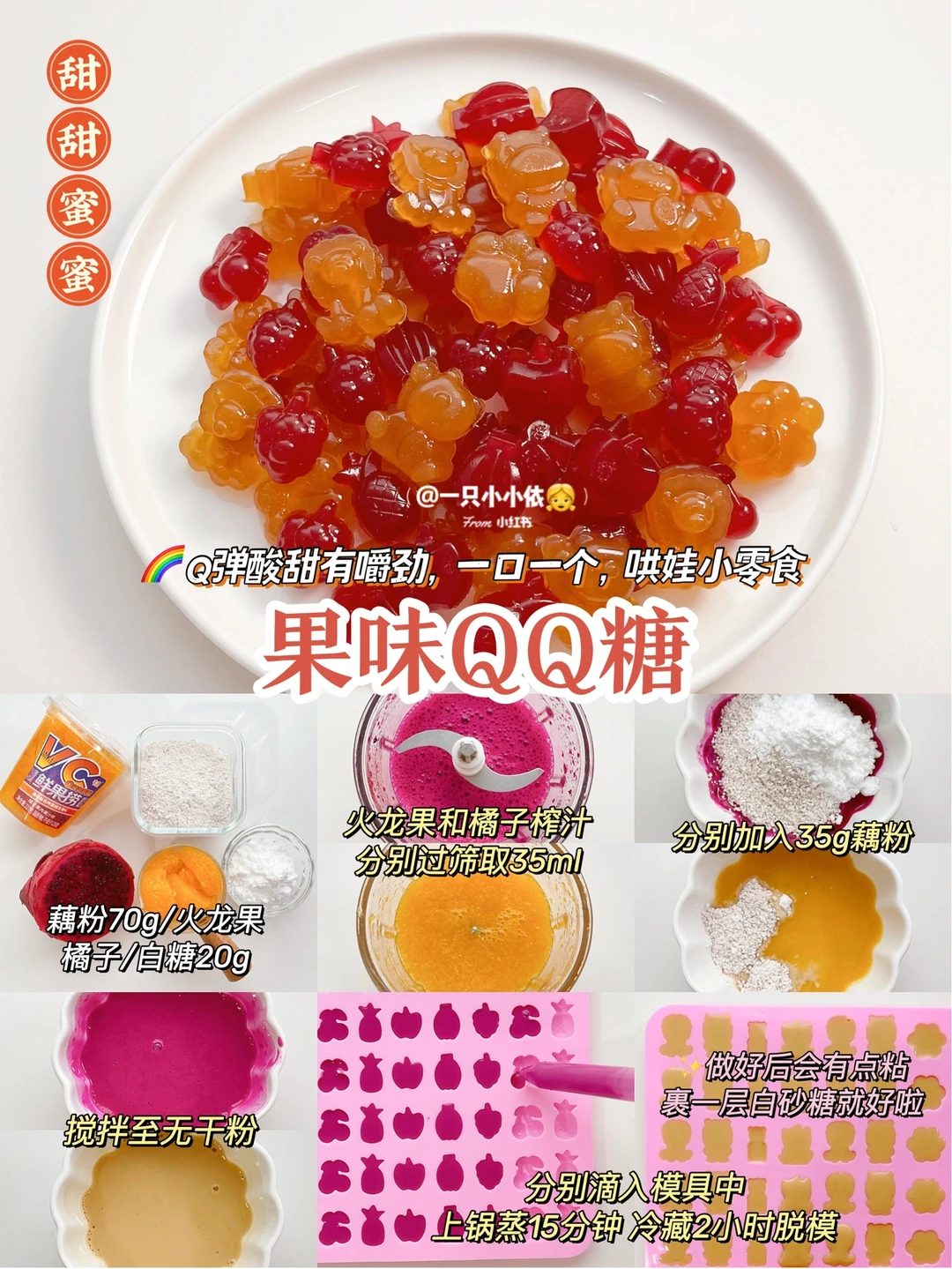 🔹做法:火龙果和橘子榨汁,分别过筛取35ml,再分别加入35g藕粉,搅拌至无干粉;分别滴入模具中,上锅蒸15分钟,冷藏2小时后脱模
