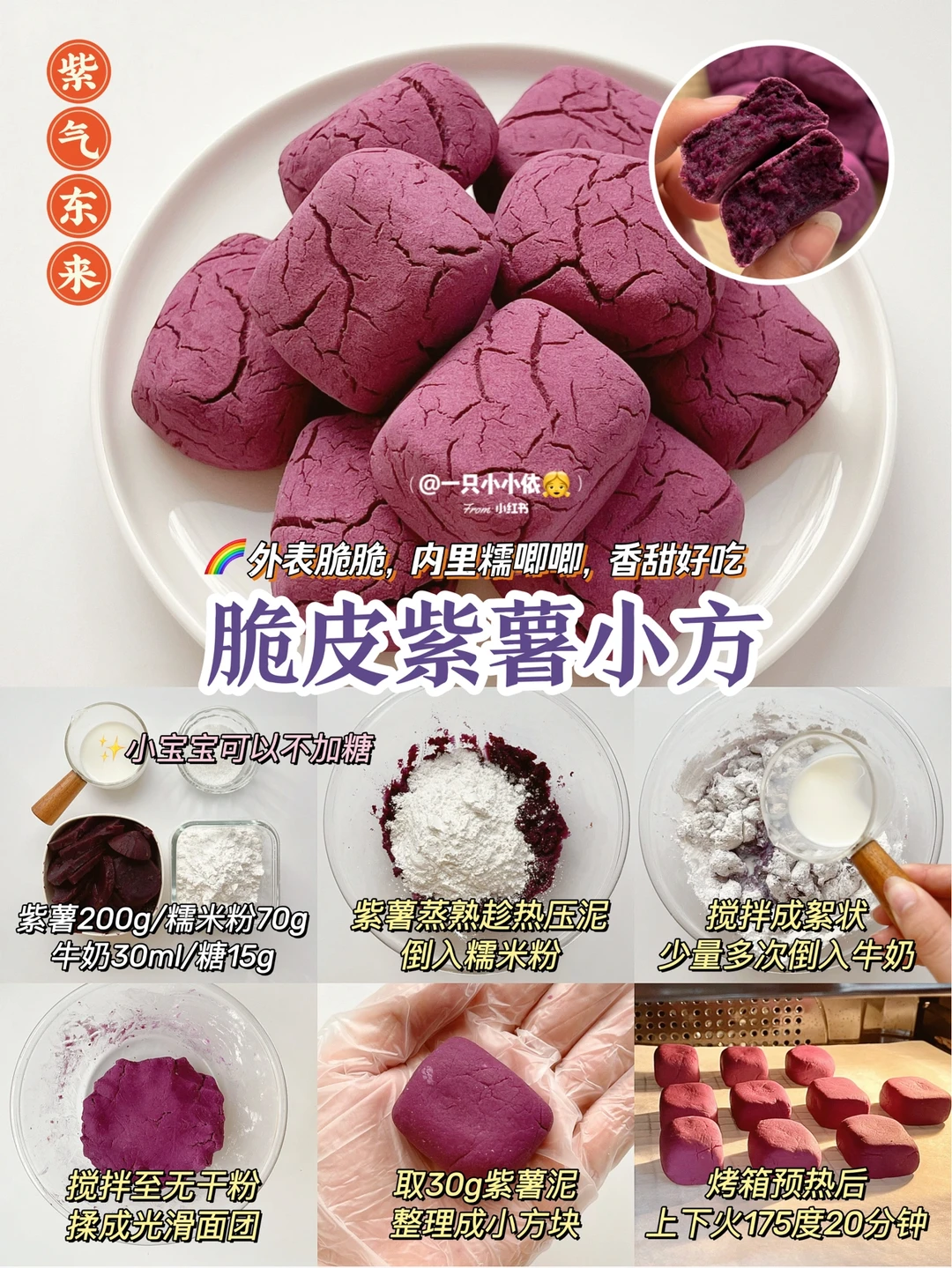 🔹做法:紫薯蒸熟趁热压泥,倒入糯米粉,搅拌成絮状,少量多次倒入牛奶,搅拌至无干粉,揉成光滑面团;取30g紫薯泥,整理成小方块;烤箱预热上下火175度20分钟
