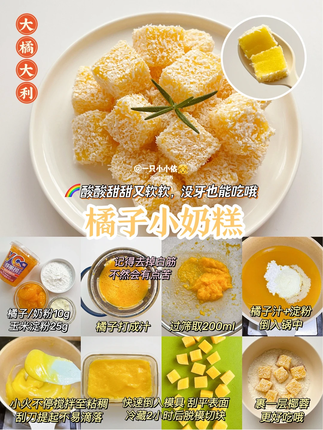 🔹做法:橘子打成汁,过筛取200ml;橘子汁+淀粉倒入锅中,小火不停搅拌至粘稠,刮刀提起不易滴落,快速倒入模具,刮平表面,冷藏2小时候脱模切块