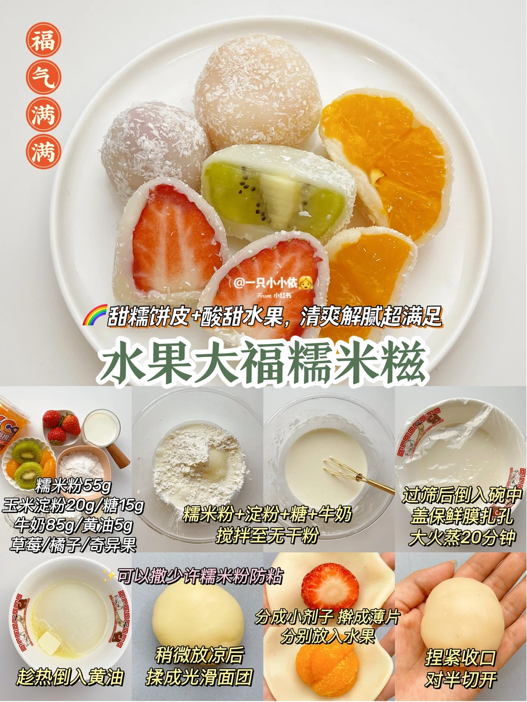 🔹做法:糯米粉+淀粉+糖+牛奶,搅拌至无干粉,过筛后倒入碗中,盖保鲜膜扎孔,大火蒸20分钟,趁热倒入黄油,稍微放凉后揉成光滑面团;分成小剂子擀成薄片,分别放入水果,捏紧收口,对半切开