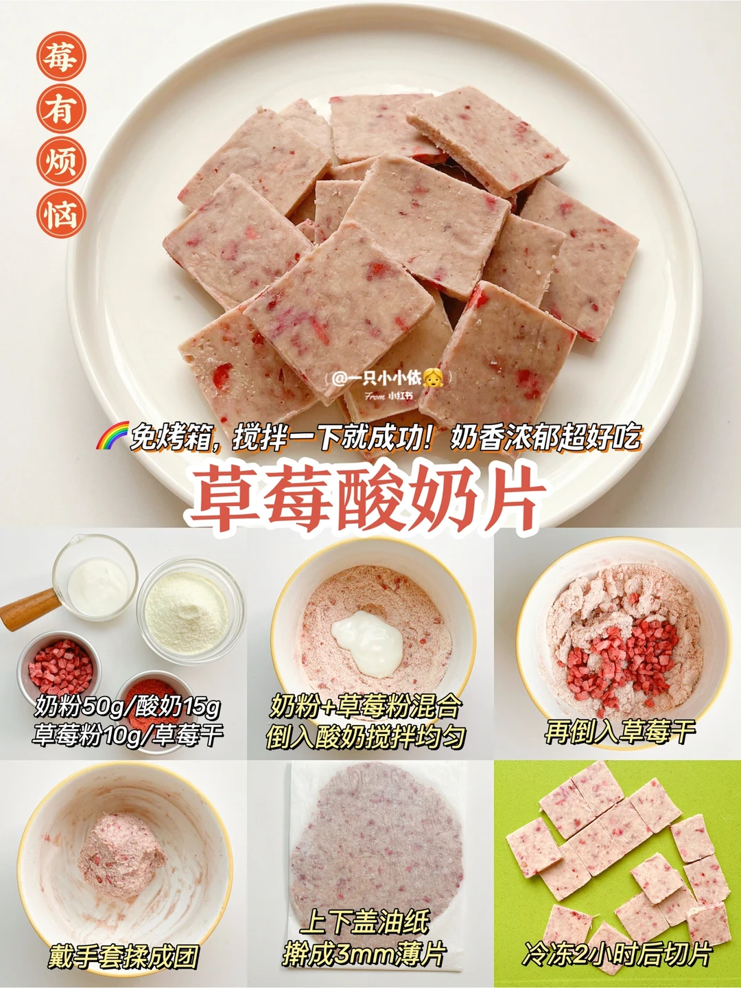 🔹做法:奶粉+草莓粉混合,倒入酸奶搅拌均匀,再倒入草莓干,戴手套揉成团;上下铺油纸,擀成3mm薄片,冷冻2小时候切片