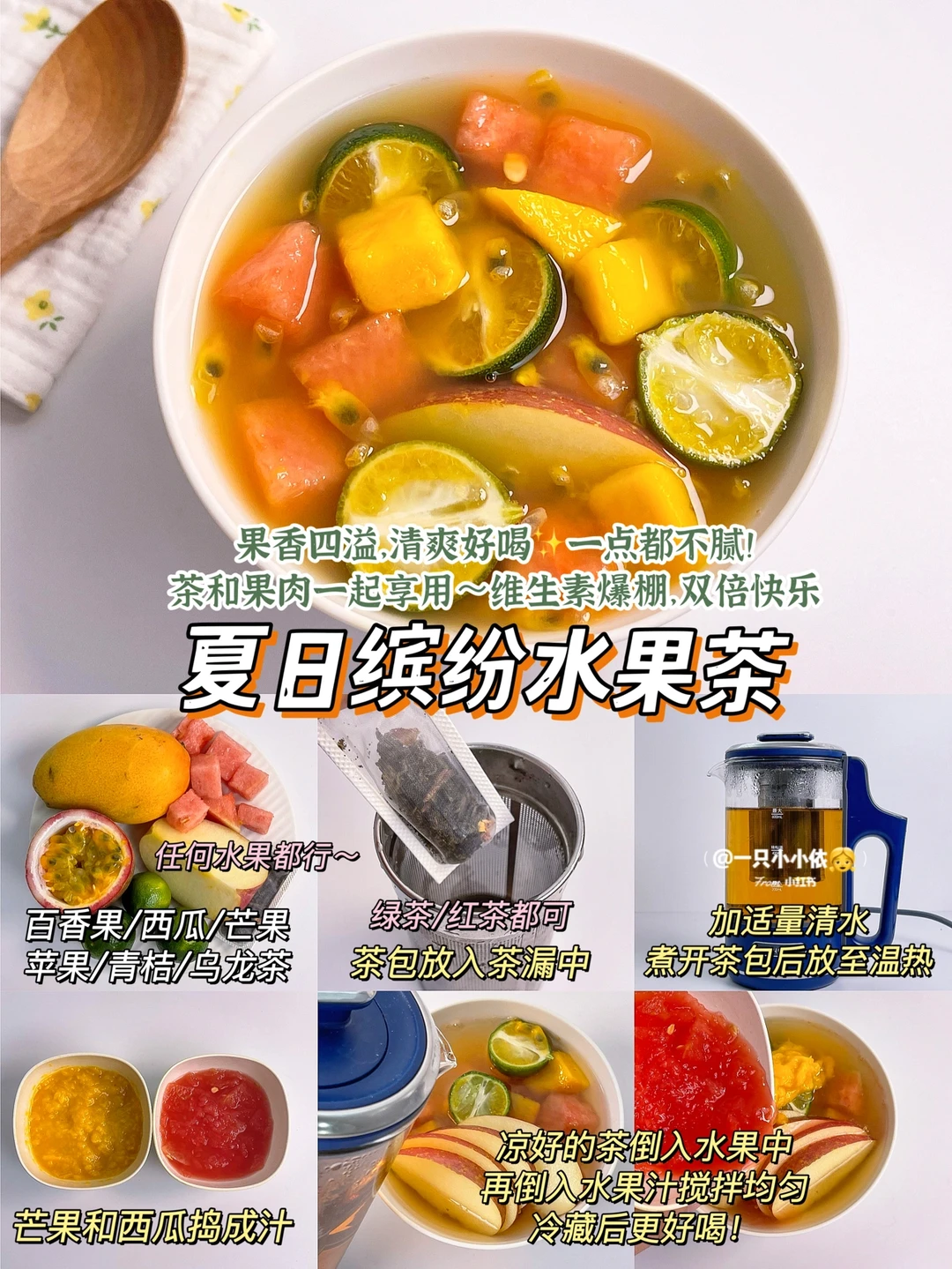 🔹做法:茶包放入茶漏中,加清水煮开后放至温热;芒果和西瓜捣成汁;晾好的茶倒入水果中,再倒入水果汁搅拌均匀,冷藏后更好喝!
