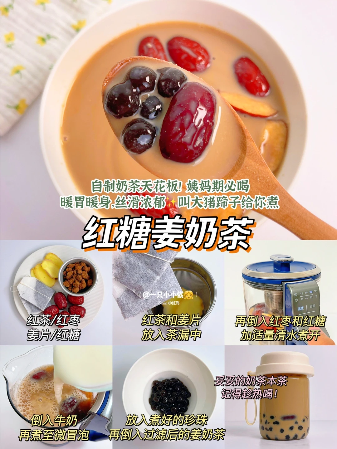 🔹做法:红茶和姜片放入茶漏中,再倒入红枣和红糖,加适量清水煮开;倒入牛奶再煮至微冒泡;放入煮好的珍珠,倒入姜奶茶,记得趁热喝哦