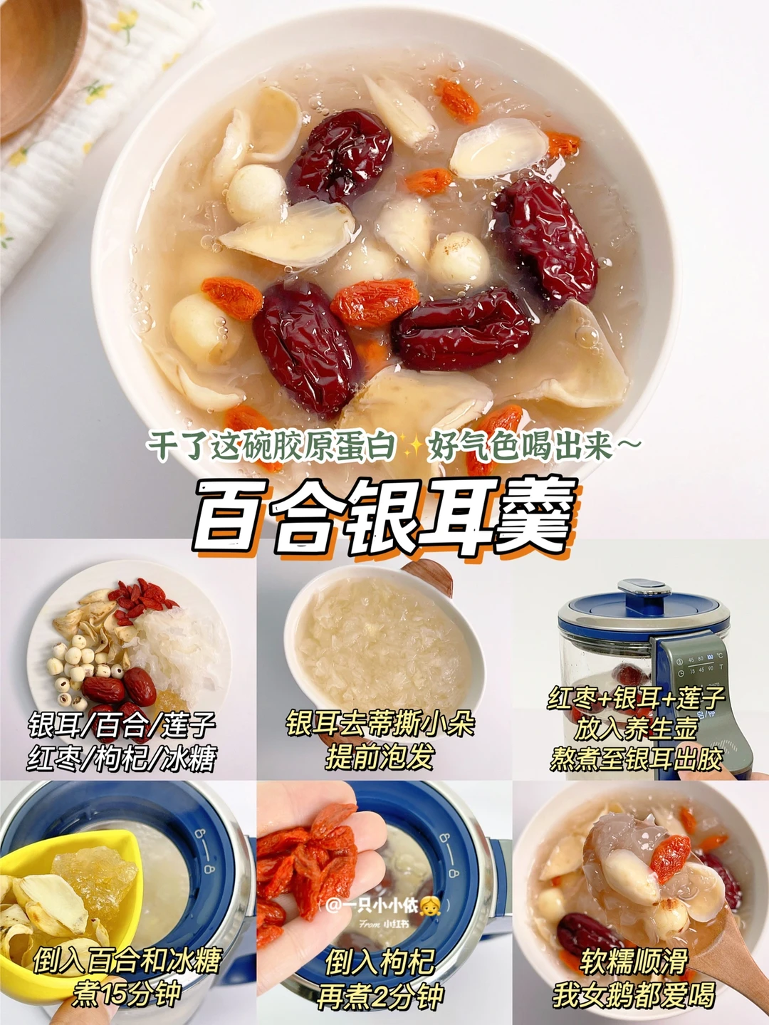 🔹做法:银耳去蒂撕成小朵,提前泡发;红枣+银耳+莲子倒入养生壶,熬煮至银耳出胶;倒入百合和冰糖,煮15分钟;再倒入枸杞煮2分钟