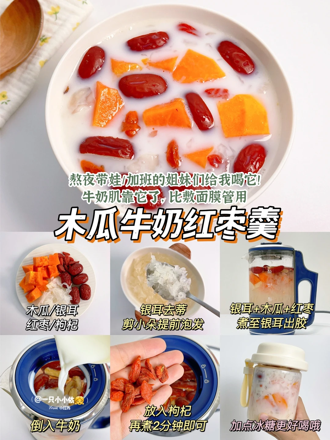 🔹做法:银耳去蒂撕成小朵,提前泡发;银耳+木瓜+红枣倒入养生壶中,加清水煮至银耳出胶;倒入牛奶、放入枸杞,再煮2分钟